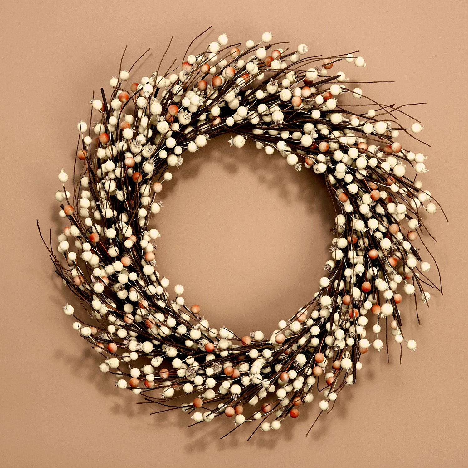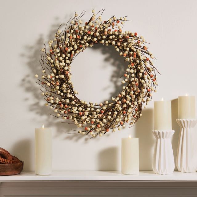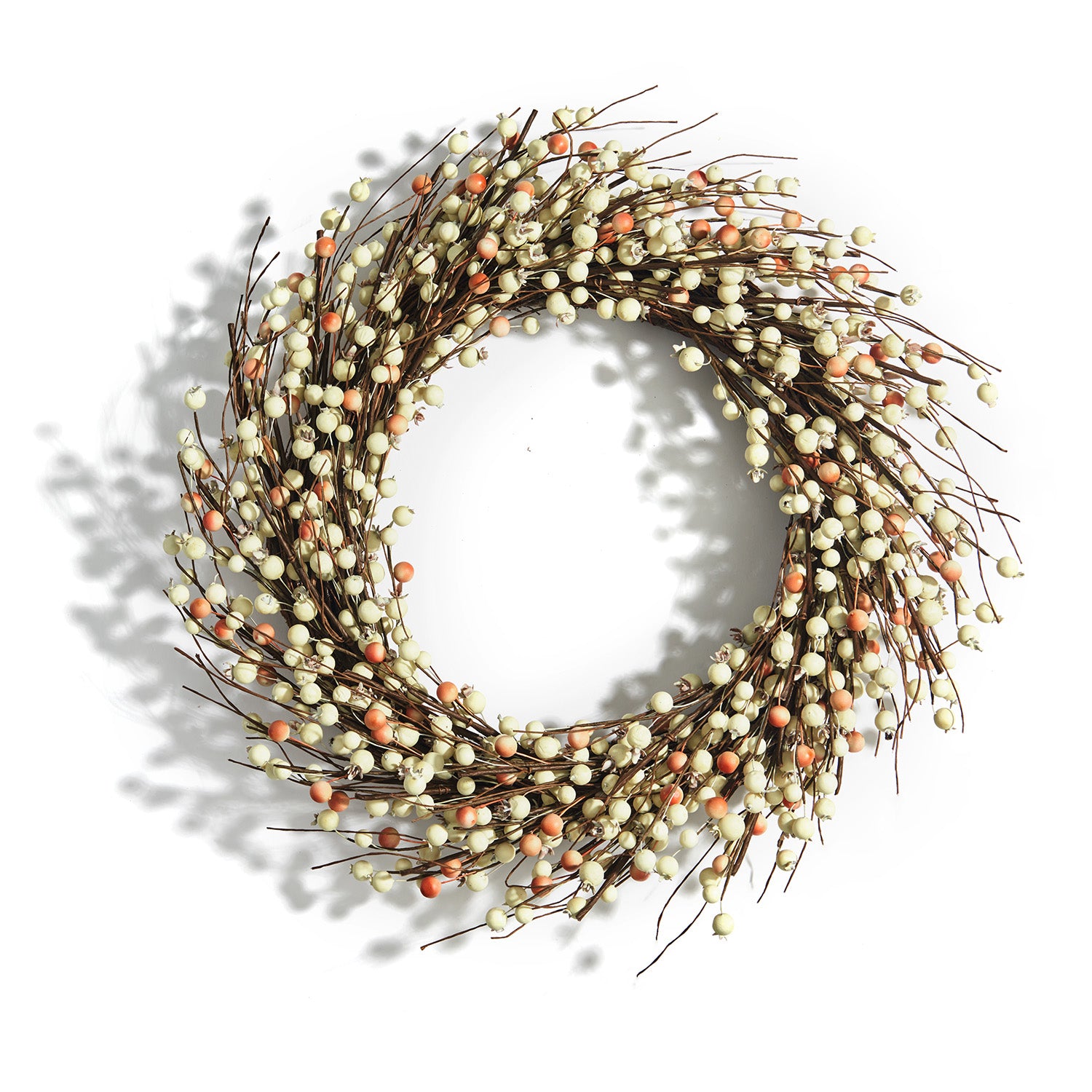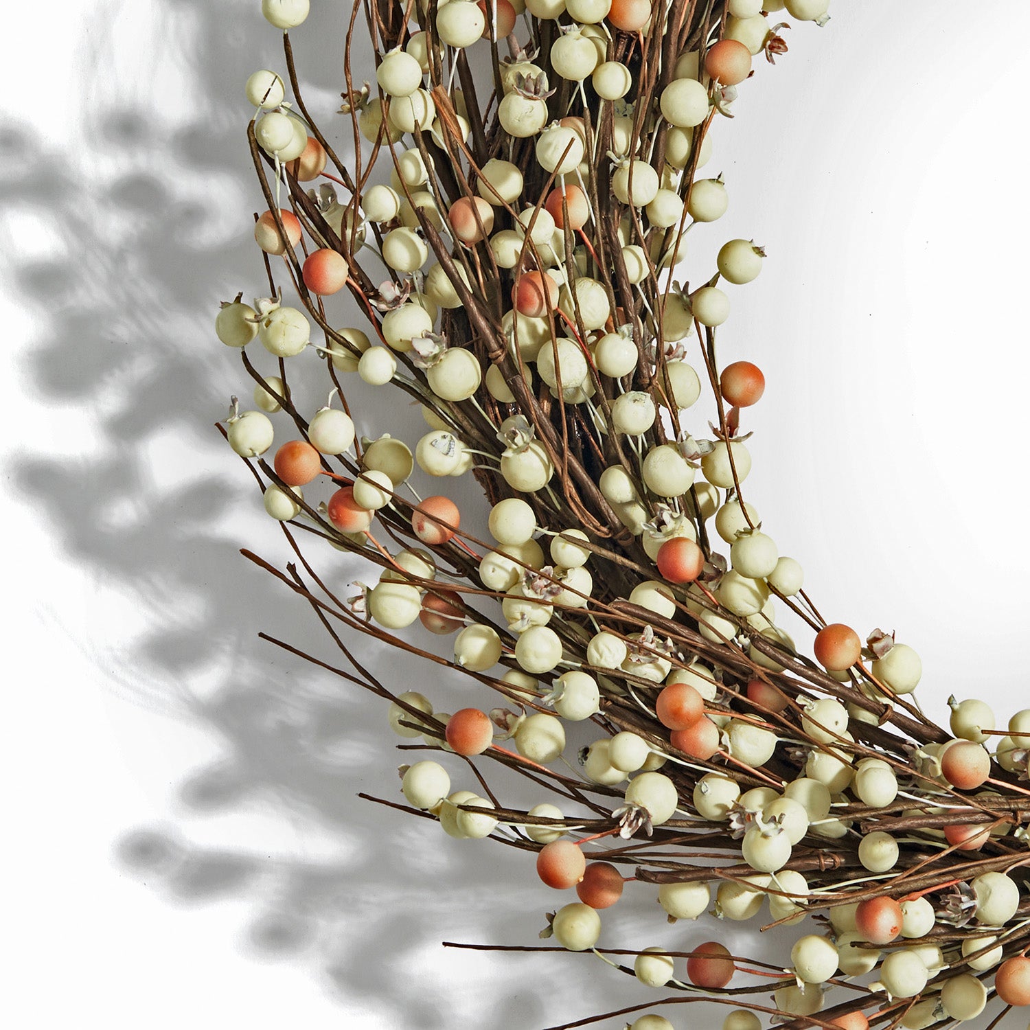 Bring the beauty of nature indoors and invigorate your seasonal decor with our Alba Berry Farmhouse Wreath. Countless creamy faux berries with buds cluster together to form a richly textured wreath, with accents of apricot colored berries and sprightly lifelike brown twigs. Hand-painted and assembled by skilled artisans for added realism, this natural twig wreath has pliable stems and measures 22” in diameter. Our Alba Berry wreath suits the modern organic home; Hang it on a door, above a fireplace mantel, or use it as a festive centerpiece for your Thanksgiving table.