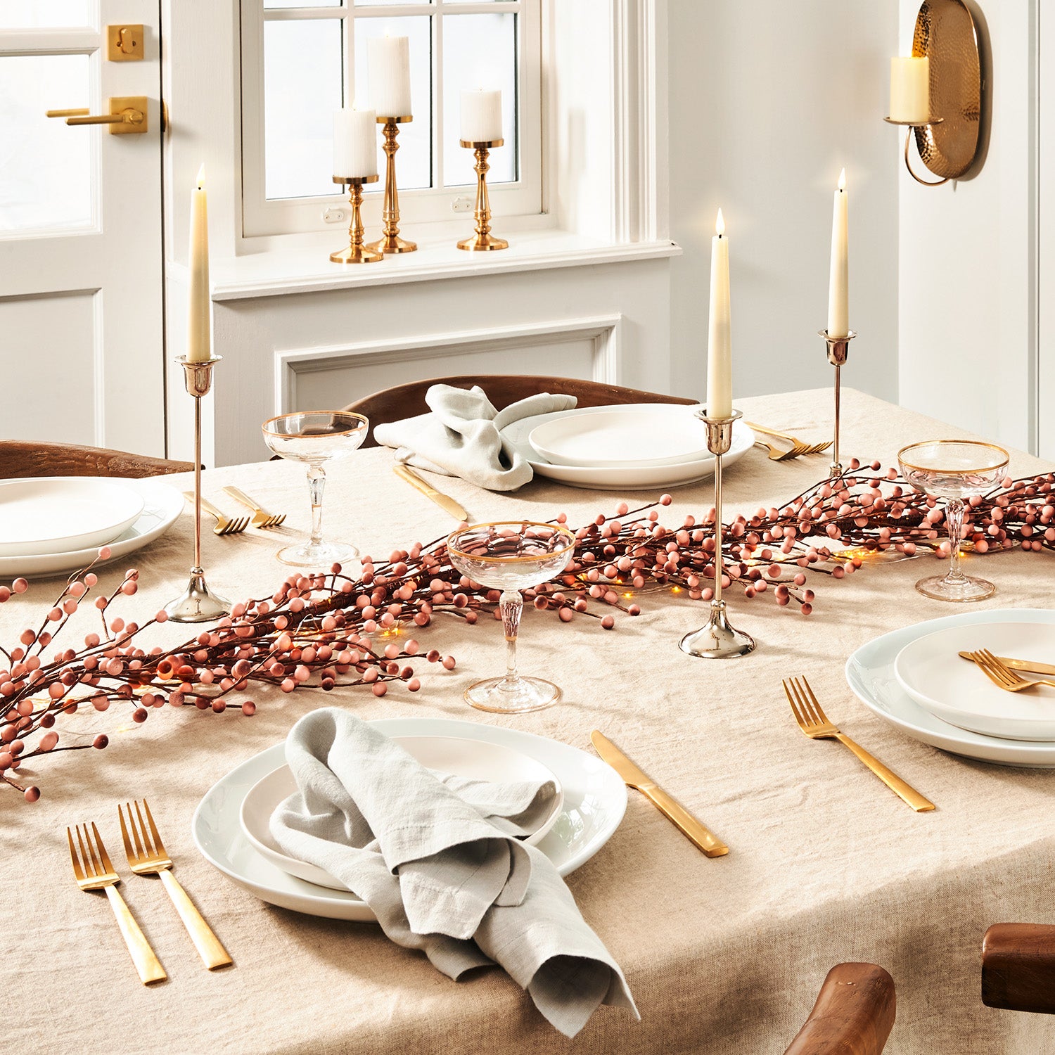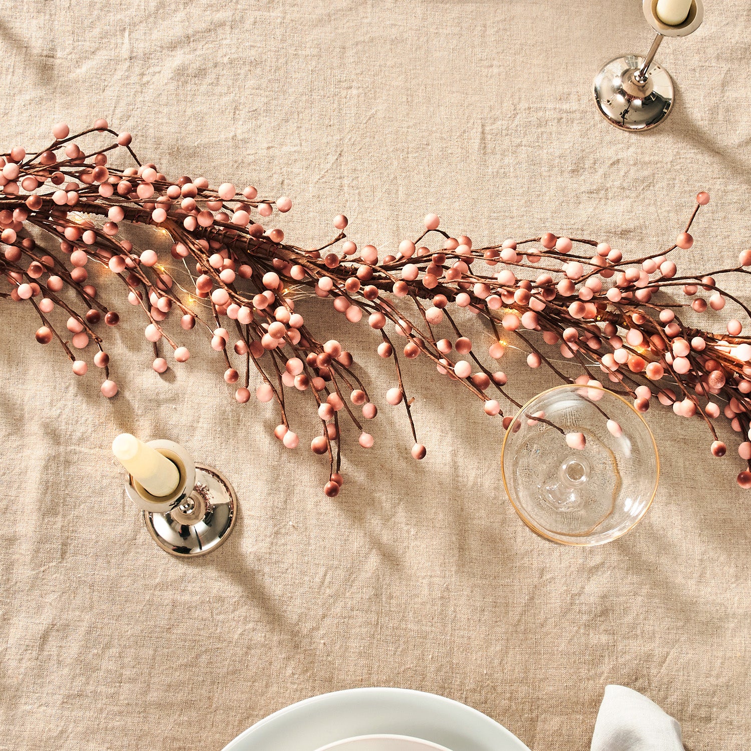 This romantic, cheerful garland features intertwined branches with decorative pink berries, illuminated by warm, dewy LED lights. Arrange along a dining table as a centerpiece or drape across a mantle for a festive, romantic touch. Perfect for wedding tablescapes, Valentine's Day date night or a simple spring refresh around your home.