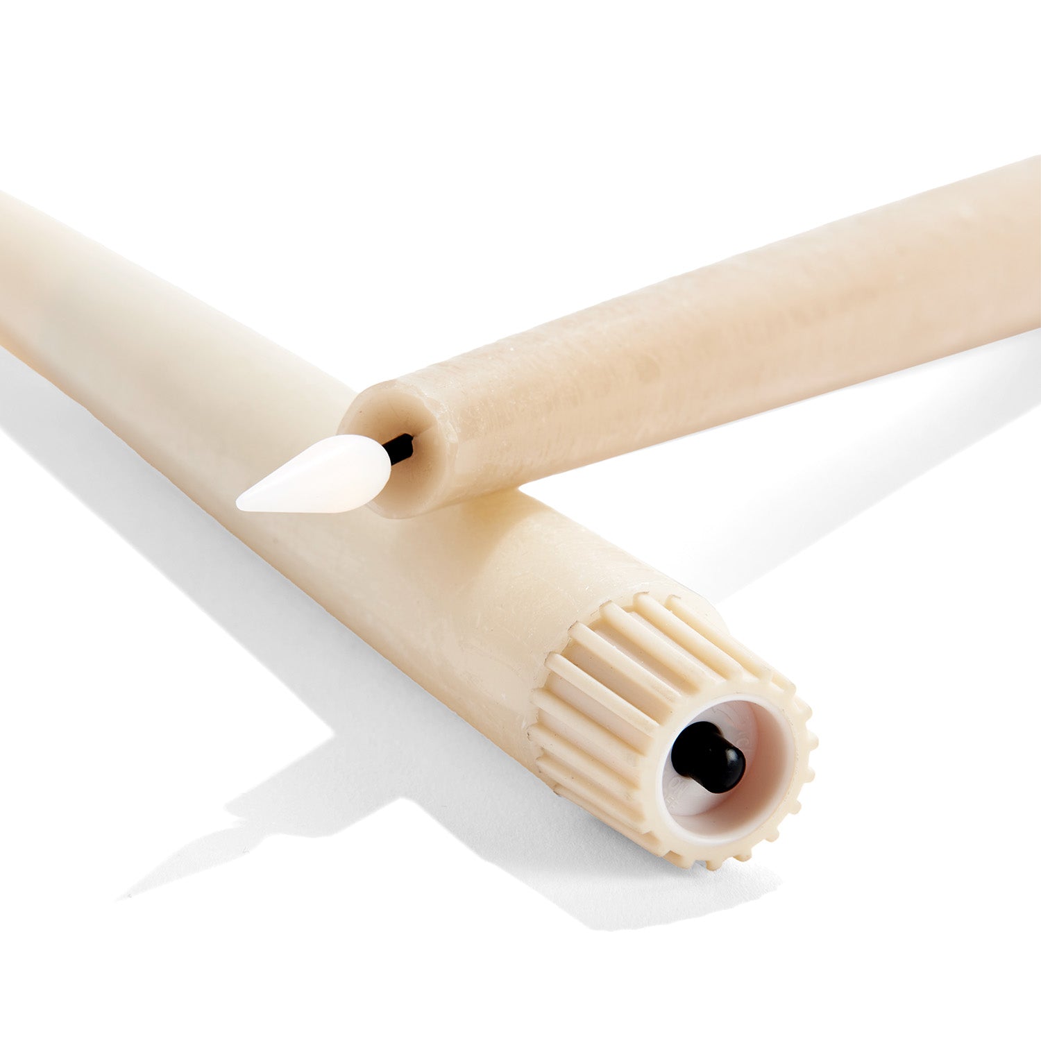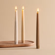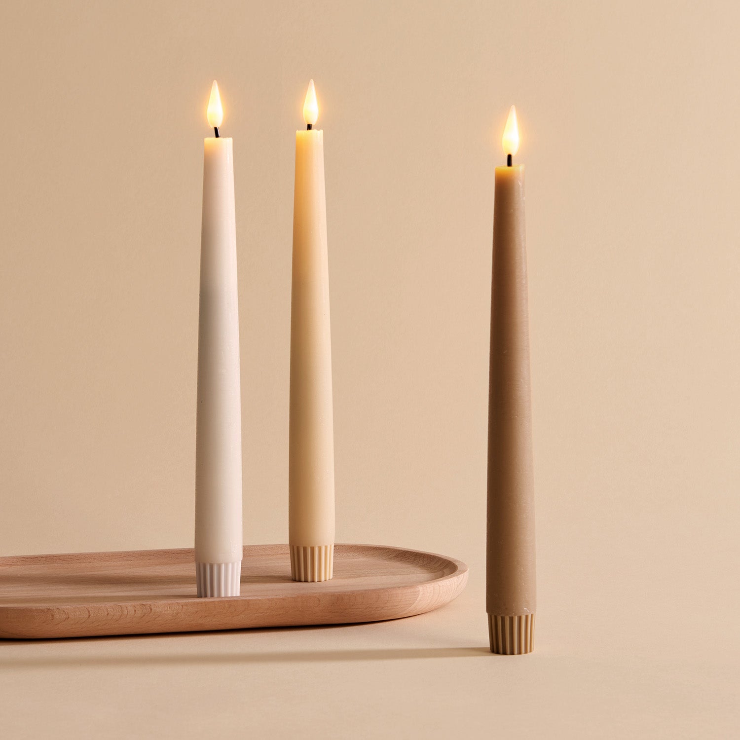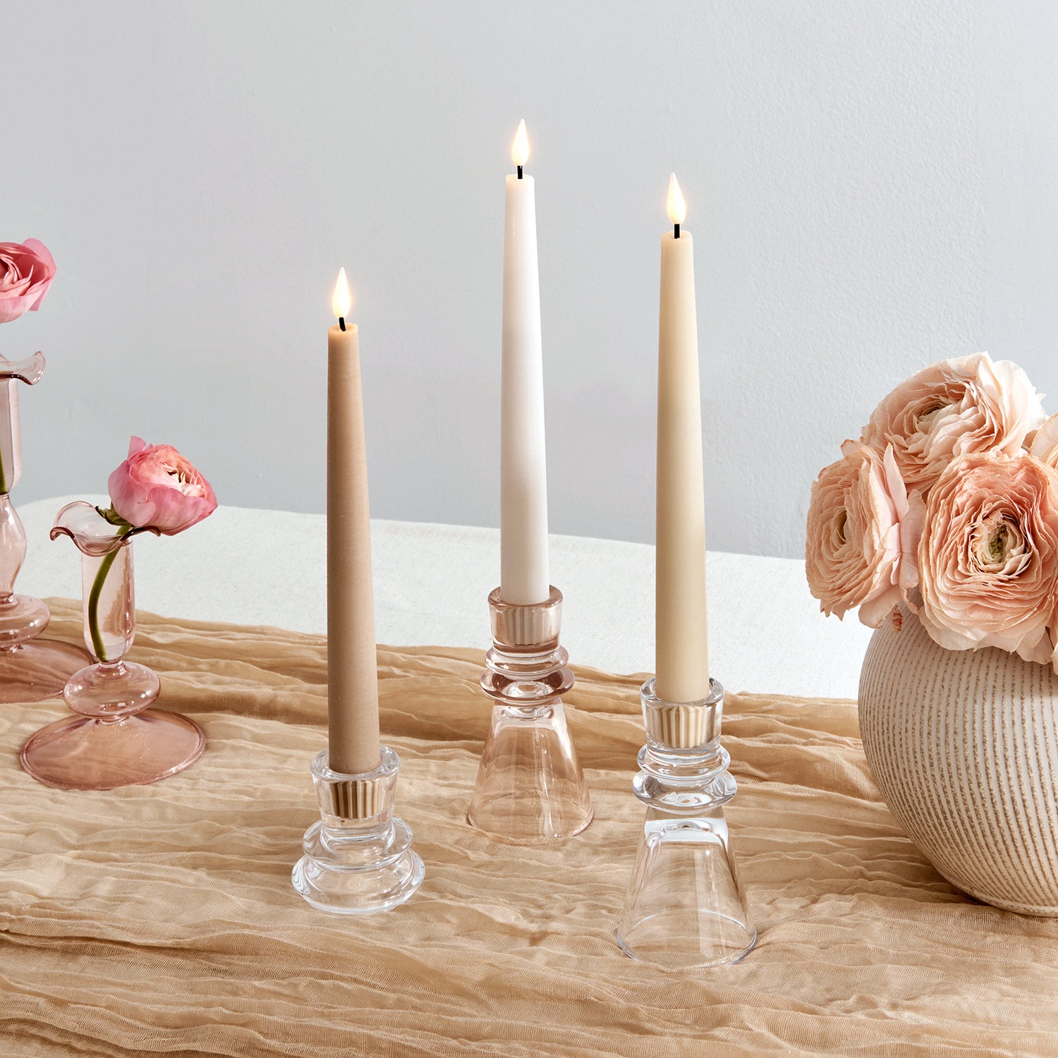 This candle set includes three elegant candles in shades of cream colors, topped with our distinctive Infinity Wick LED flames. Each candle in the pack is a different color, creating a gradient ombre effect when the candles are set together. These battery-powered taper candles are a beautiful, versatile addition to any style of decor, boasting a real wax exterior finished with a unique, distressed texture. Our Infinity Wick tapers fit most standard candle holders, come with a convenient remote control, and arrive in beautiful giftable packaging, making them an ideal holiday or housewarming gift. Place among botanicals to accentuate a floral centerpiece and elevate any dinner table, or add them to your everyday decor for a fun pop of color. Perfect for home, weddings, holidays, and special events.