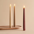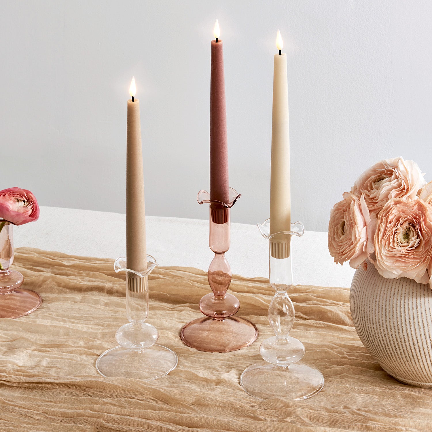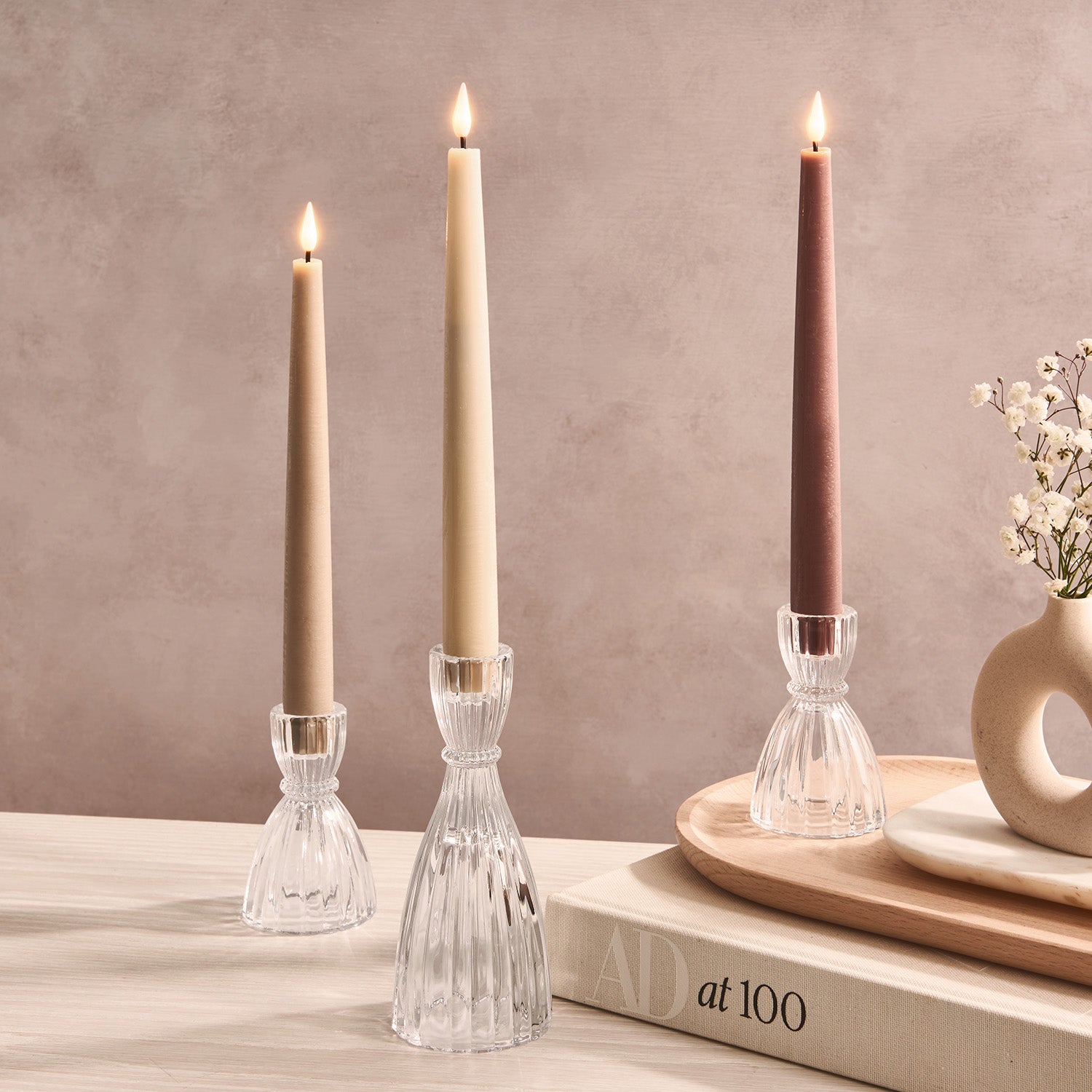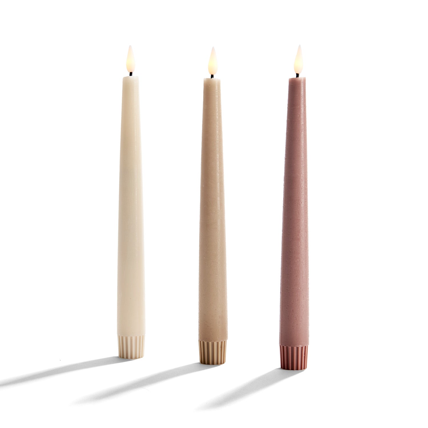 This candle set includes three elegant candles in shades of cream colors, topped with our distinctive Infinity Wick LED flames. Each candle in the pack is a different color, creating a gradient ombre effect when the candles are set together. These battery-powered taper candles are a beautiful, versatile addition to any style of decor, boasting a real wax exterior finished with a unique, distressed texture. Our Infinity Wick tapers fit most standard candle holders, come with a convenient remote control, and arrive in beautiful giftable packaging, making them an ideal holiday or housewarming gift. Place among botanicals to accentuate a floral centerpiece and elevate any dinner table, or add them to your everyday decor for a fun pop of color. Perfect for home, weddings, holidays, and special events.