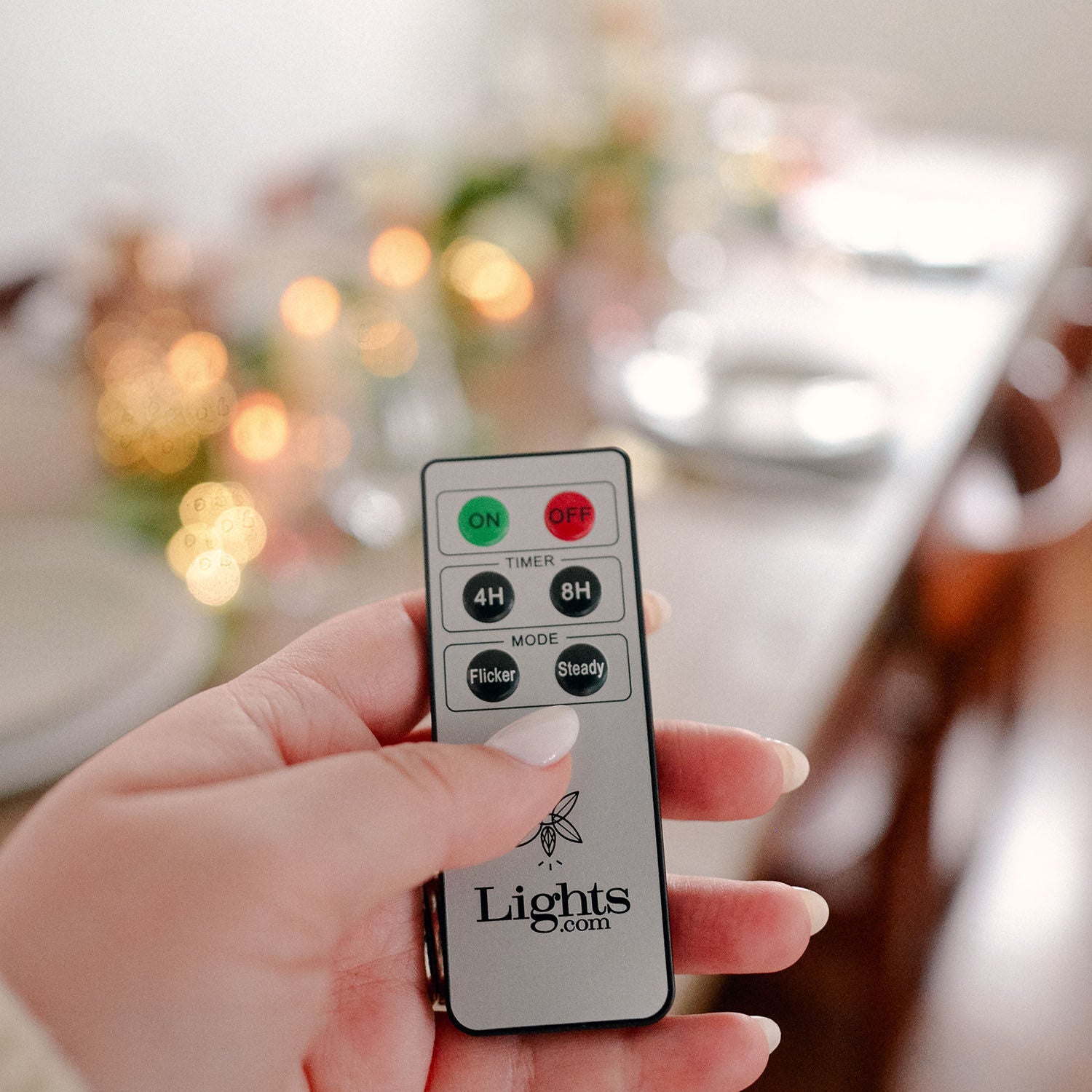 • Use the included six-button remote to choose between steady or flicker, and set the optional four or eight-hour timer