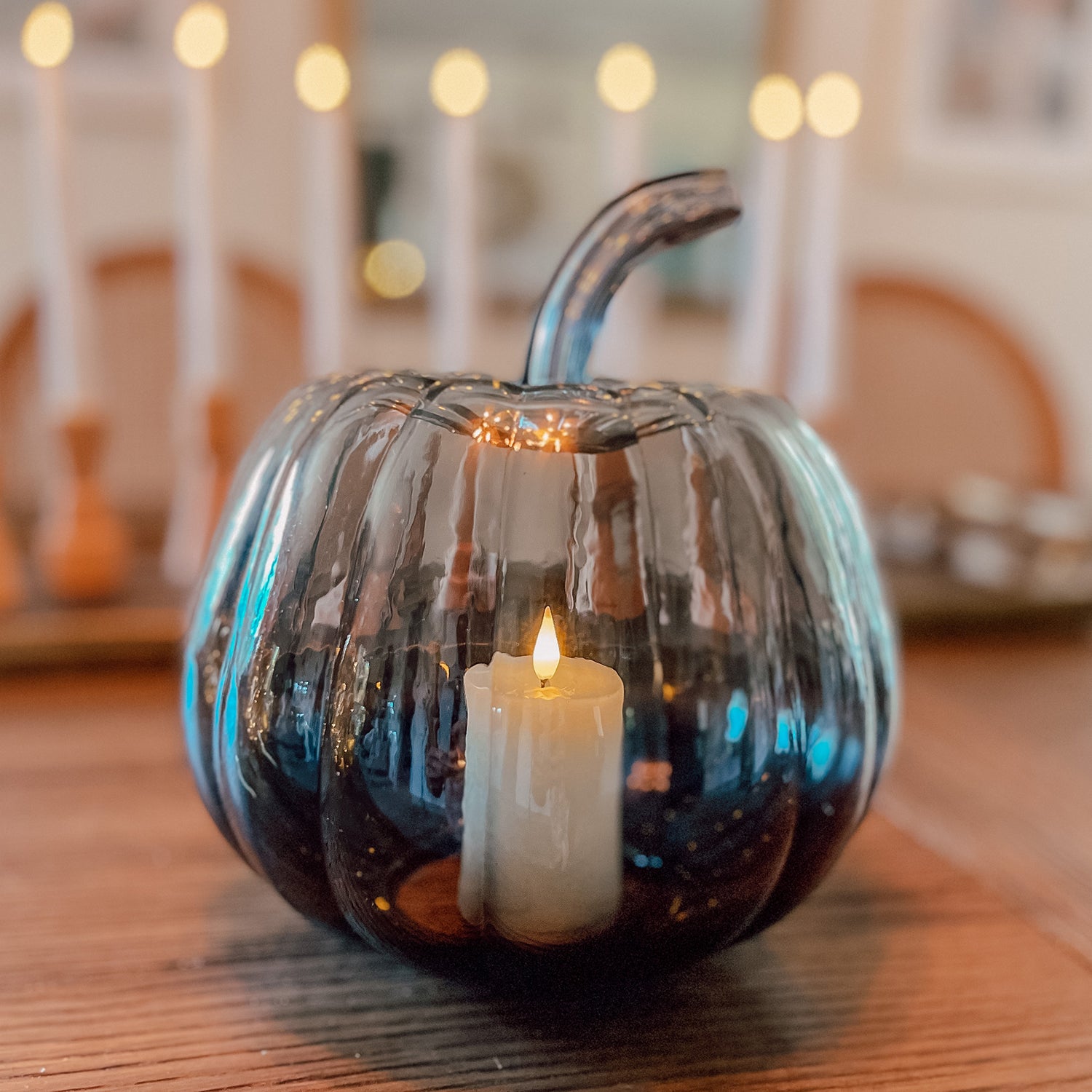 This beautiful decorative glass pumpkin cloche is a chic and modern update to your fall decor. Pair this 8" pumpkin with the included flameless LED votive candle to create a warm moody glow. The grey-to-black ombre-colored glass makes this perfect for Halloween or for a modern black-and-white Thanksgiving display. Intended for indoor use, it can be placed on your mantel or the focal point of your tablescape or window display. This can also be paired with string lights or placed outside with an outdoor candle for trick-or-treaters to enjoy. Substantial in size and versatile in style, the Blair pumpkin is suitable for the entire season!