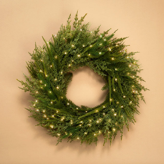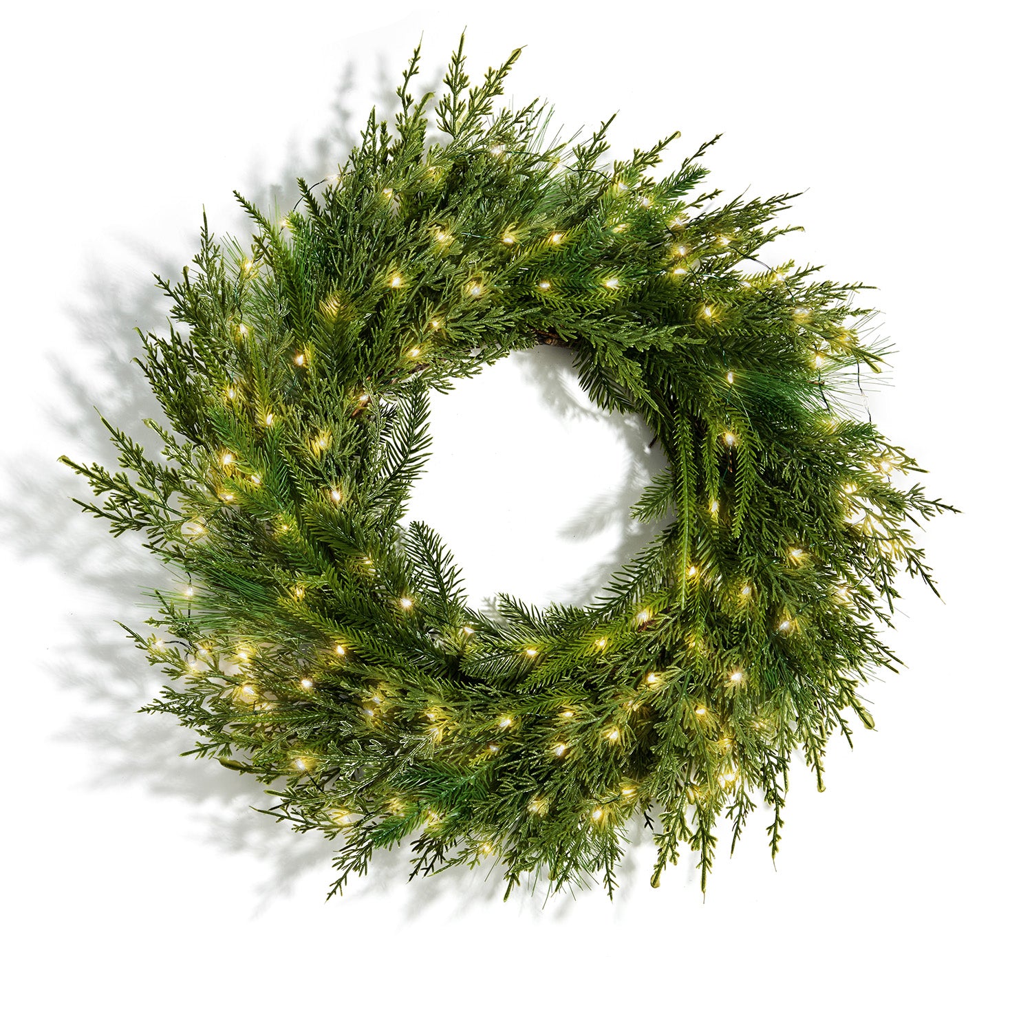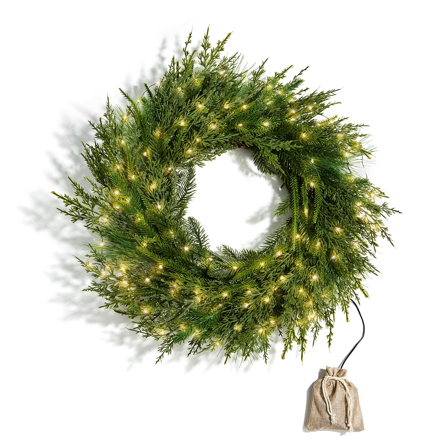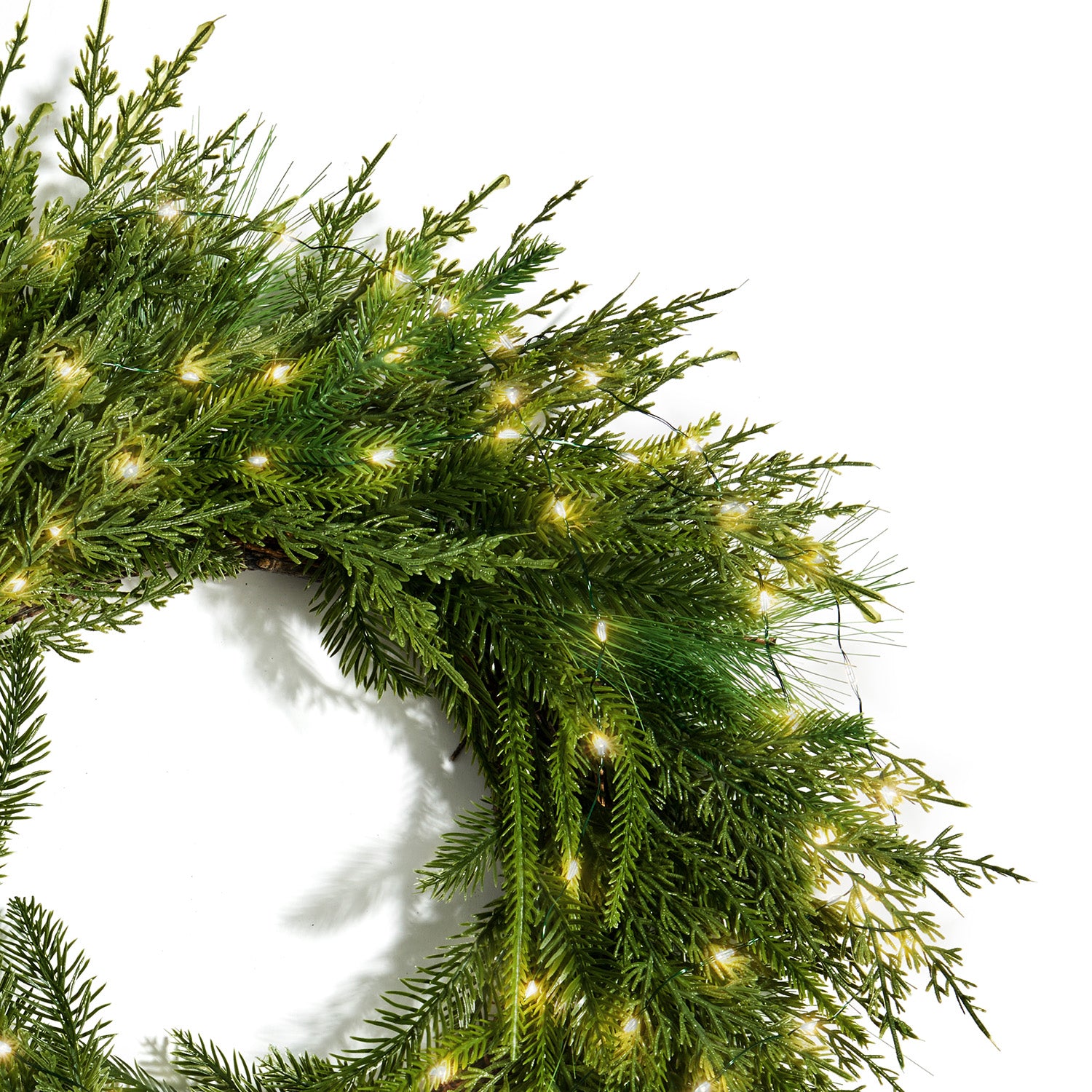 • One 24" wreath of lush artificial alpine fir, hemlock, and cypress, and pre-lit with warm white LED fairy lights