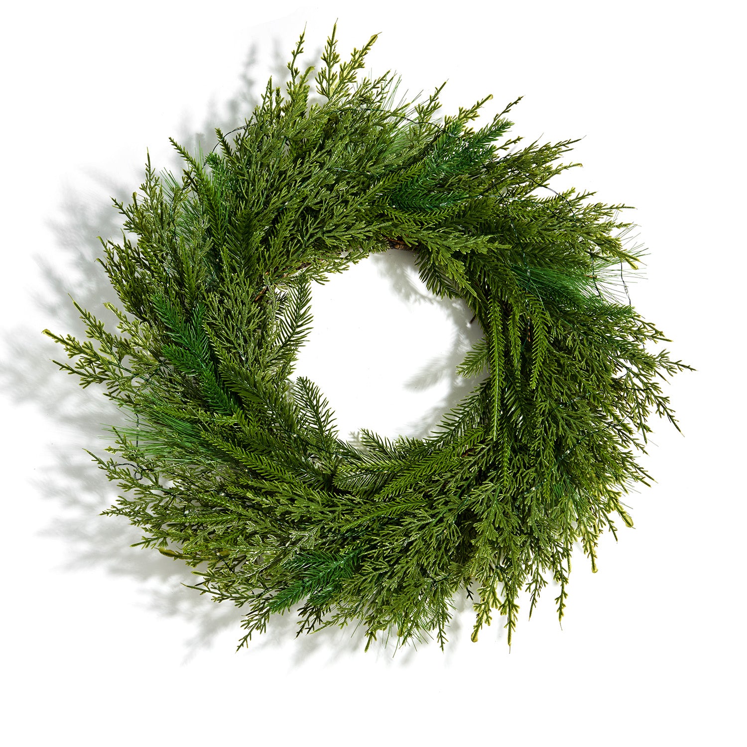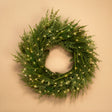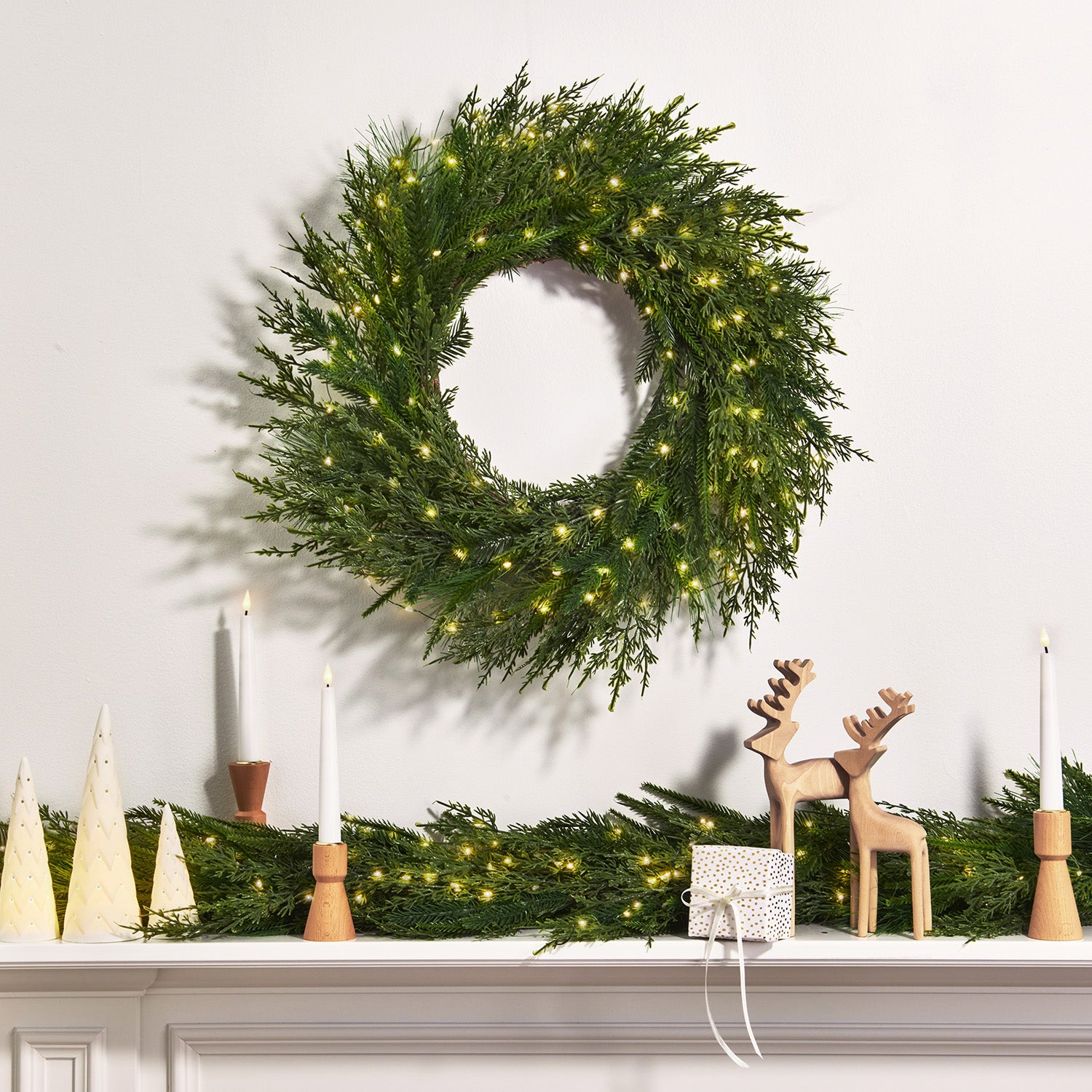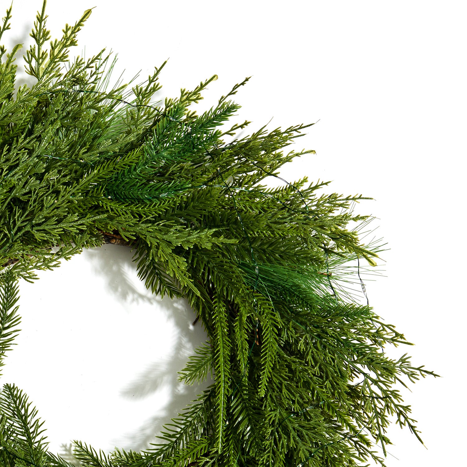• One 24" wreath of lush artificial alpine fir, hemlock, and cypress, and pre-lit with warm white LED fairy lights