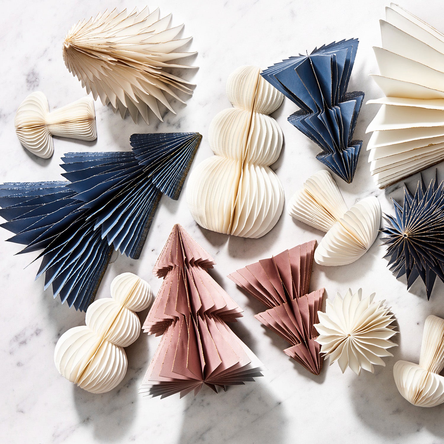Create a festive winter mood in your home with this set of small paper Christmas trees. Crafted from sturdy rose-colored paper with gold glitter edging, these paper trees go from flat to 3D in seconds thanks to their honeycomb construction and hidden magnetic closure. Stand them on a mantel or tabletop, place them in a window sill, or arrange them with our flameless candles for a memorable holiday tablescape. Easy to assemble and quick to store away, these cheery Christmas trees will bring a smile to your face year after year.