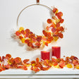 • One striking brass hoop adorned with a mix of lush, fall harvest colored leaves, and pre-lit with bright fairy lights