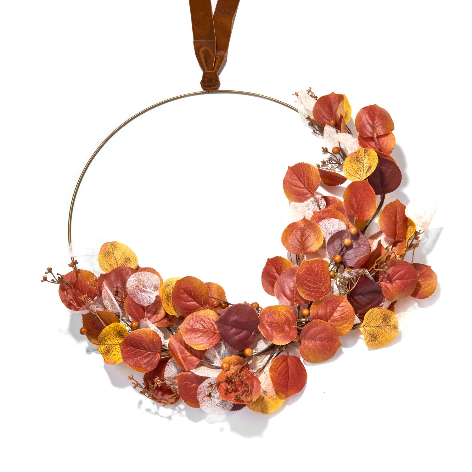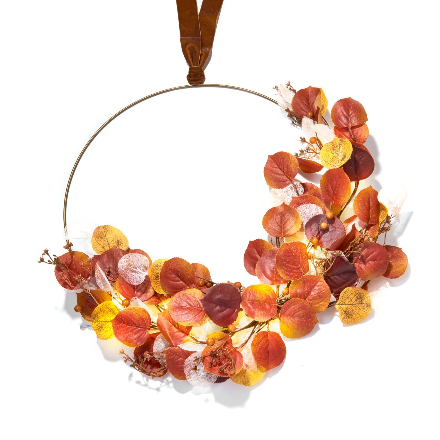This festive, elegantly asymmetrical wreath is composed of a wide brass hoop and features waves of leaves in a mix of gorgeous autumn colors. The botanical element is generously filled out with leaves in warm browns, oranges, and yellows; punctuated with sheer white leaves for added texture and depth, and lit with 48 bright white LEDs. At the top of the wreath, the brass is formed into a convenient loop for easy installation anywhere. To complete the look, use the included velvet ribbon to style the wreath or as a simple, chic way to hang the item.