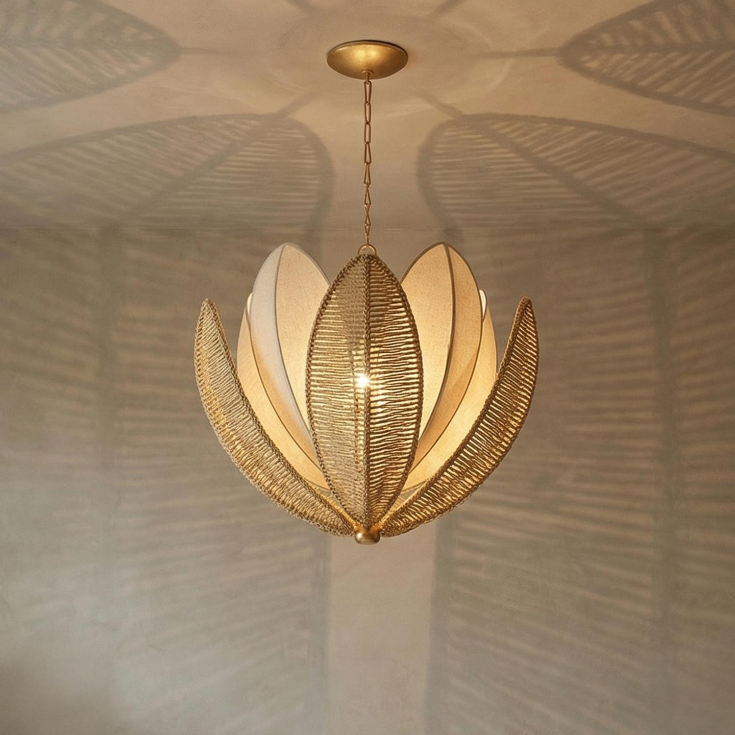 The Gardenia Chandelier 36" is a luxury statement light that makes a breathtaking impression with its organic, botanical silhouette and rich texture. The fixture is defined by a unique combination of strung coco shell beads and natural linen panels, creating a stunning, layered shade. This luxury statement light is thoughtfully scaled to provide a rich, warm, ambient glow, making it an ideal centerpiece for a large living room or grand entryway. With its UL damp rating, it offers exceptional visual interest and versatile appeal. The opulent Gold Leaf finish enhances the fixture's natural, textural elements, delivering enduring luxury and a perfect blend of elegance and simplicity.