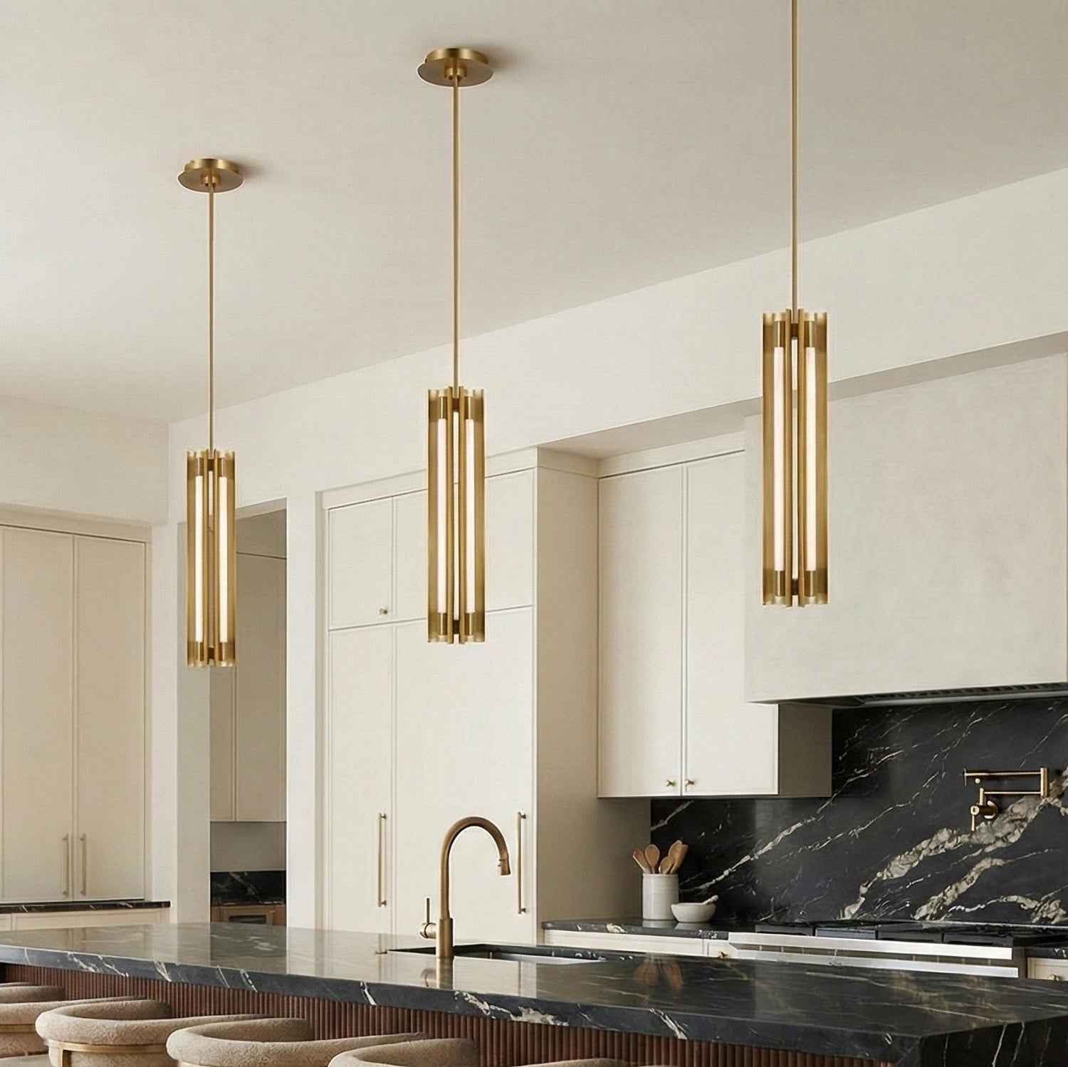 The Robin Slim 4 Light LED Pendant highlights a minimalist combination of light and metal, delivering a sleek and modern design. This fixture features an integrated LED bar that provides a seamless line of illumination, perfect for complementing a wide range of interiors. Its slender, cylindrical profile brings a sense of refined height and style, providing beautiful illumination without overwhelming the space. With its ETL damp rating and sloped ceiling compatibility, it adds both functional beauty and versatile appeal to a kitchen island or entryway. The beautiful Modern Brass finish provides a warm, metallic richness that enhances the fixture's clean lines and minimalist design, bringing a touch of timeless style to your home.