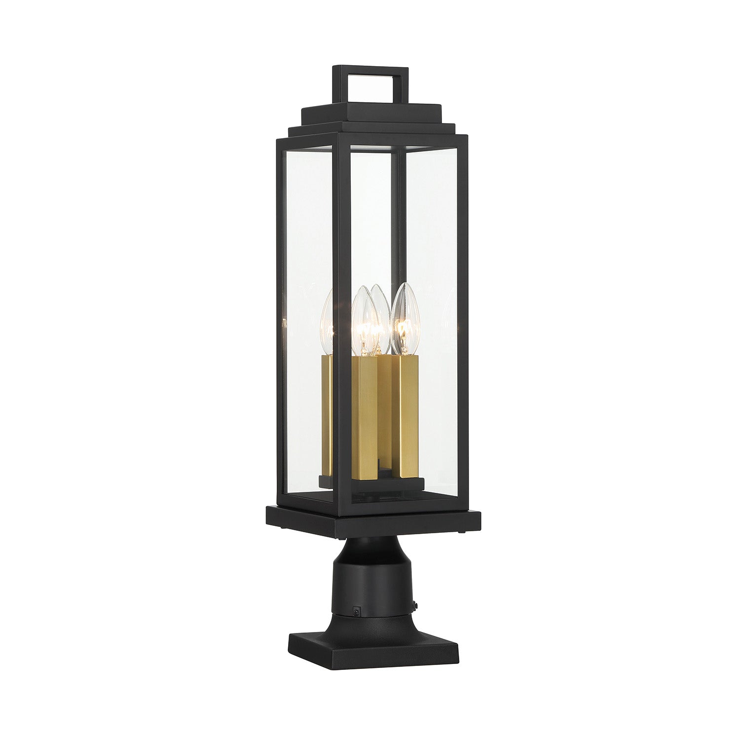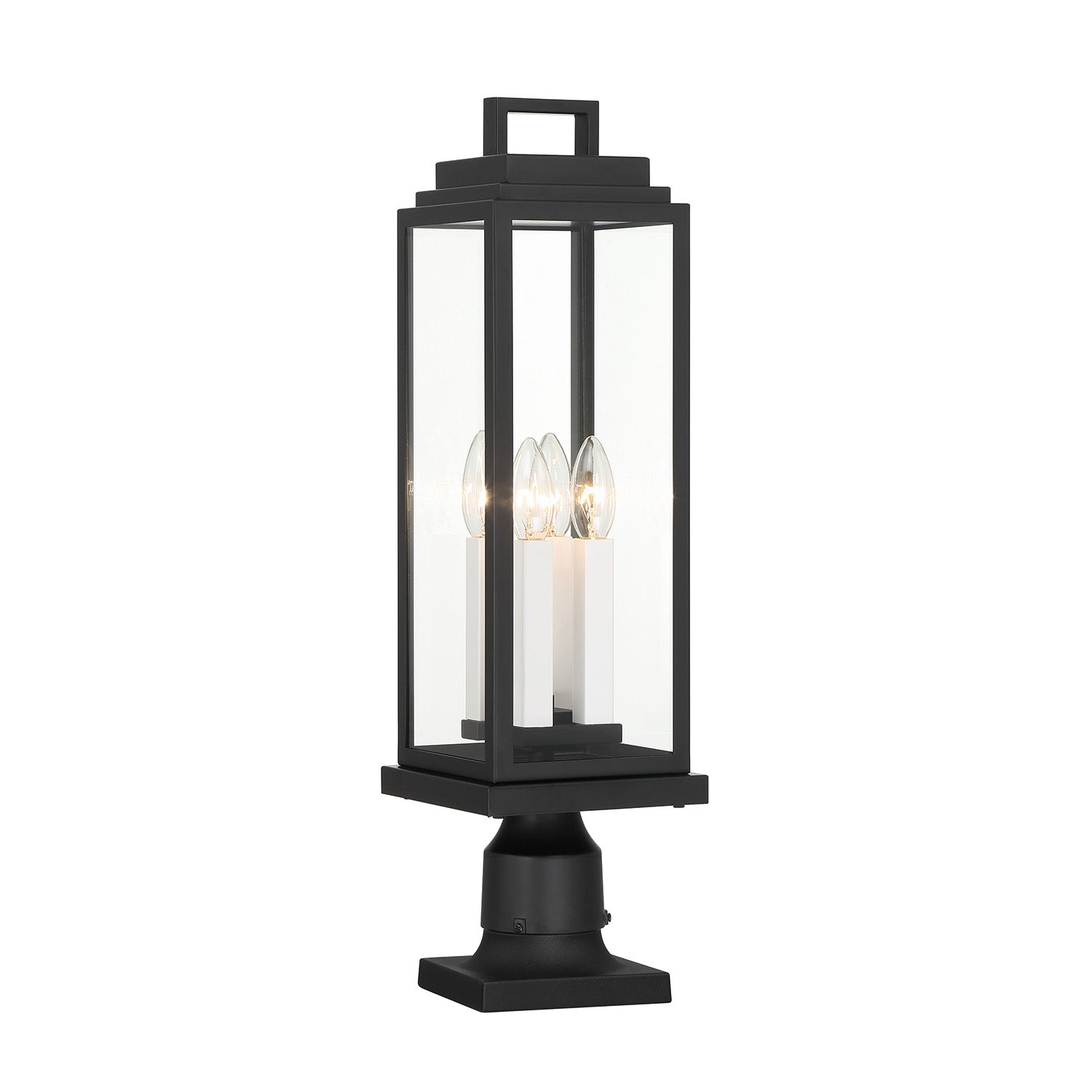 The Easton Outdoor Post Light features a sleek architectural design with a Matte Black finish. Clear glass panels surround four light sources, creating a clean and modern aesthetic for your home's exterior. This elegant fixture measures 22" tall and 6.5" wide, making it perfect for illuminating driveways, walkways, or garden areas. The stepped crown detail adds subtle visual interest to the contemporary silhouette. Weather-resistant and wet-rated for outdoor use, the Easton combines elegant style with durable construction to enhance your landscape lighting design.
