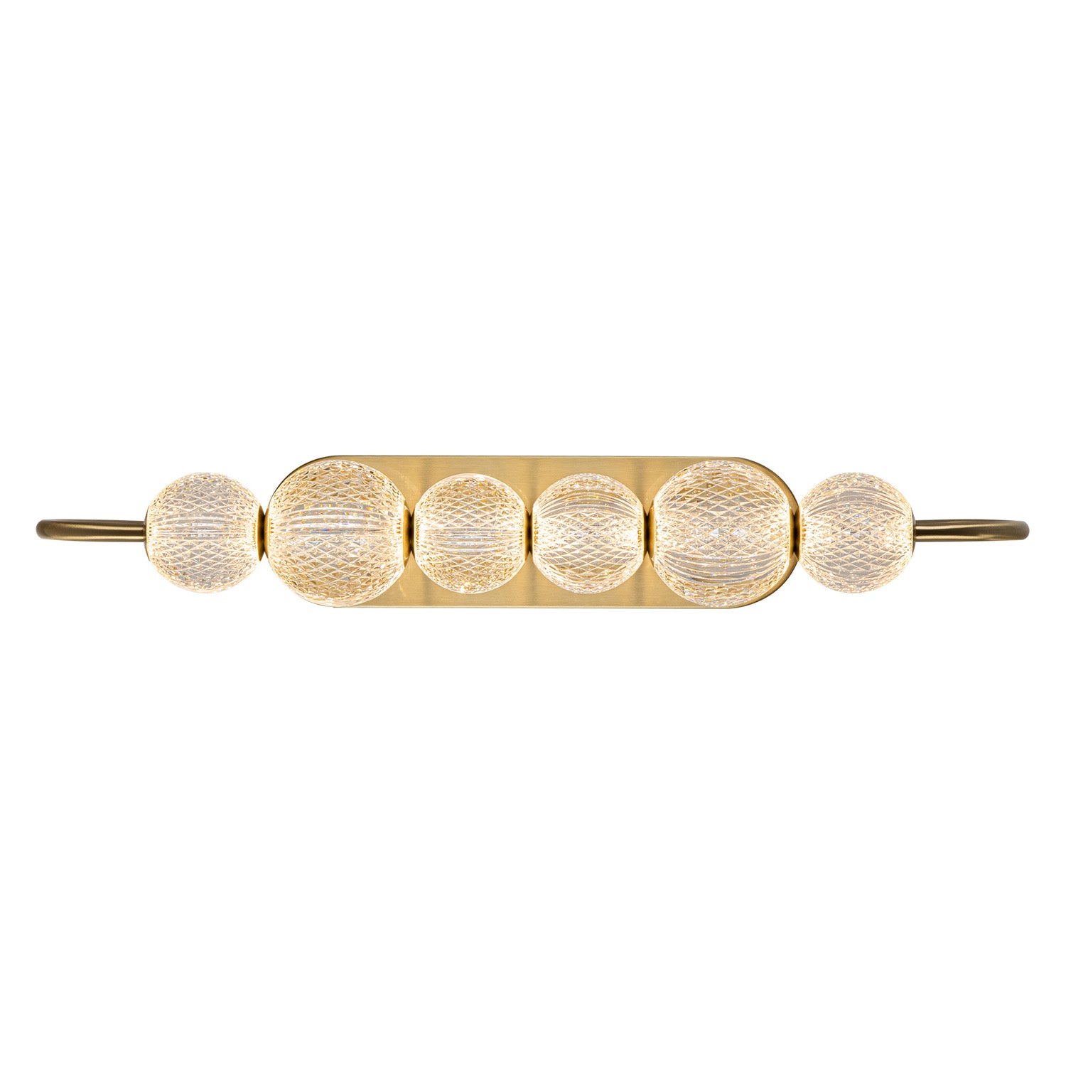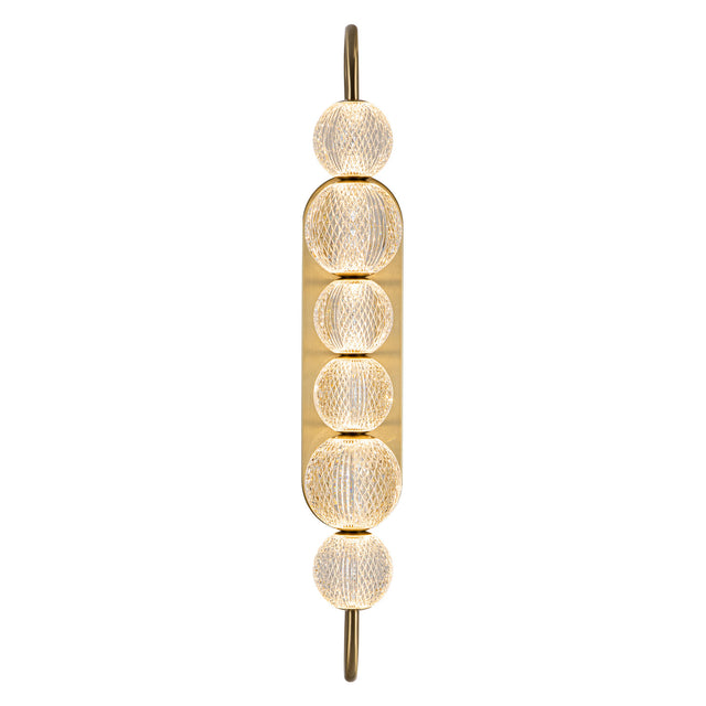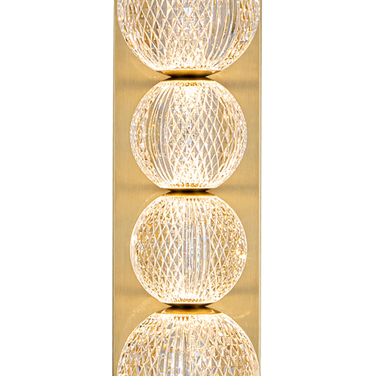 The Evelyn Curved Arm Wall Sconce elevates interior spaces with its luxurious jewelry-inspired design. This statement fixture features six intricately cut spherical shades arranged in a vertical cascade within an elegant oval brass frame. Each crystal-clear globe contains integrated LED technology that radiates through the detailed texture, casting dazzling beams of light throughout the space. The warm natural brass finish provides a sophisticated framework that beautifully complements the luminous globes. Standing at nearly 30 inches tall, this dramatic sconce creates a stunning focal point, perfect for enhancing larger wall spaces in entryways and dining areas, or as a distinctive accent in master bedrooms and luxury baths.