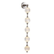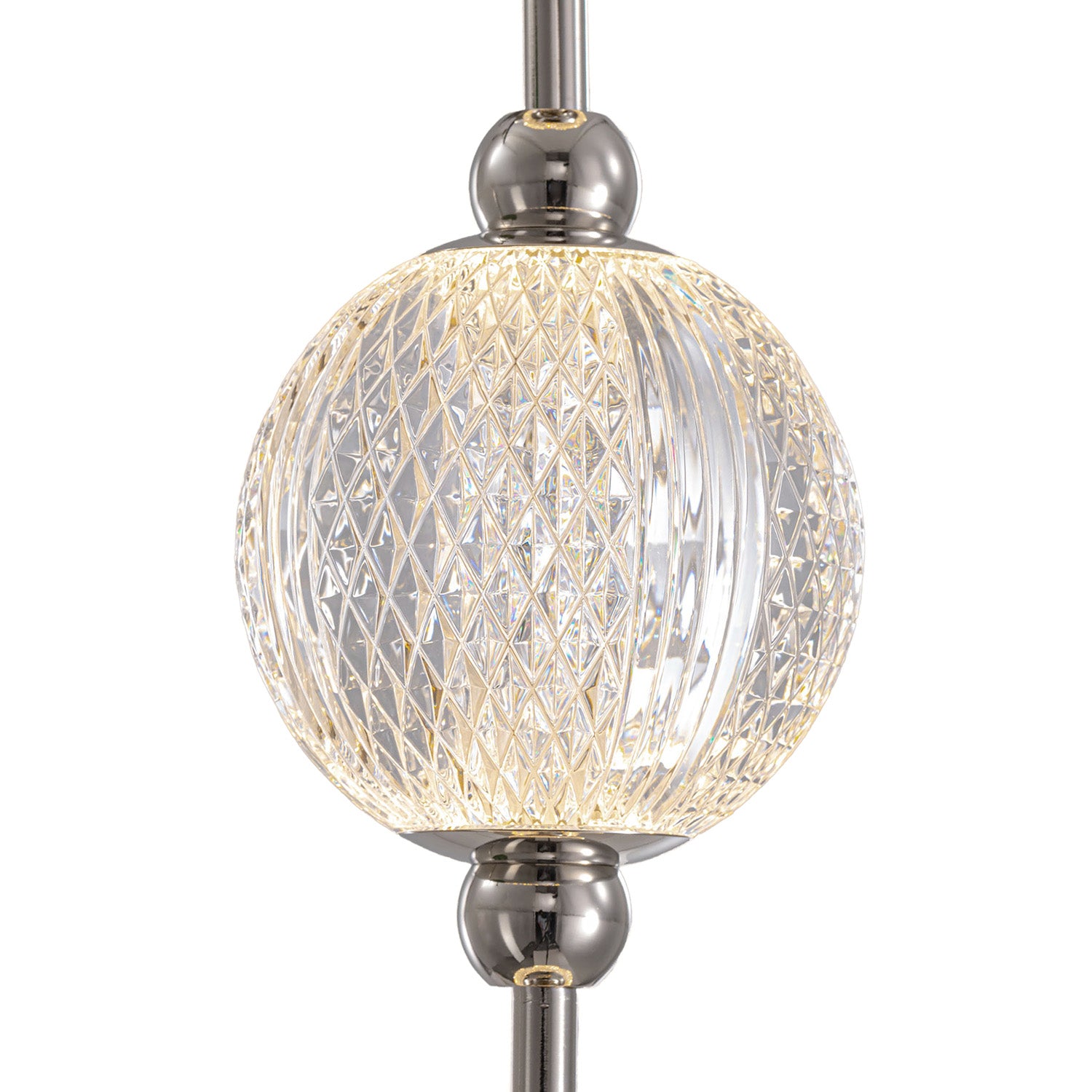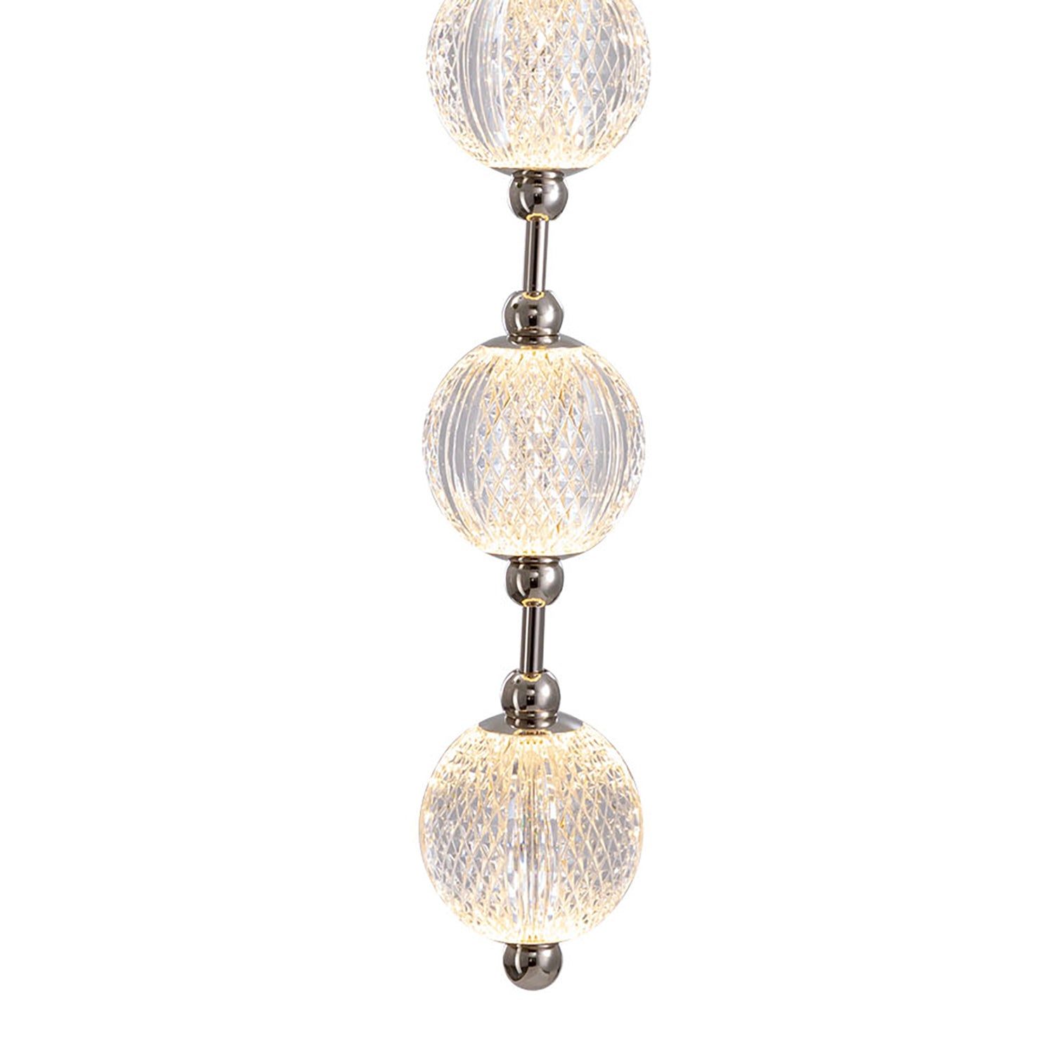 The Evelyn Wall Sconce brings a touch of refined glamour to any interior with its elegant vertical design. This sophisticated fixture features five intricately cut spherical shades that create mesmerizing light patterns when illuminated. Each crystal-clear globe contains integrated LED technology that radiates through the detailed texture, casting shimmering beams of light throughout the space. The sparkling polished nickel finish complements the five luminous globes, connected by a slender metal rod extending gracefully from a round backplate. At an impressive 38 inches tall, this statement sconce creates a bold visual presence, perfect for enhancing larger wall spaces in entryways and dining areas, or as a distinctive accent beside tall mirrors and artwork.