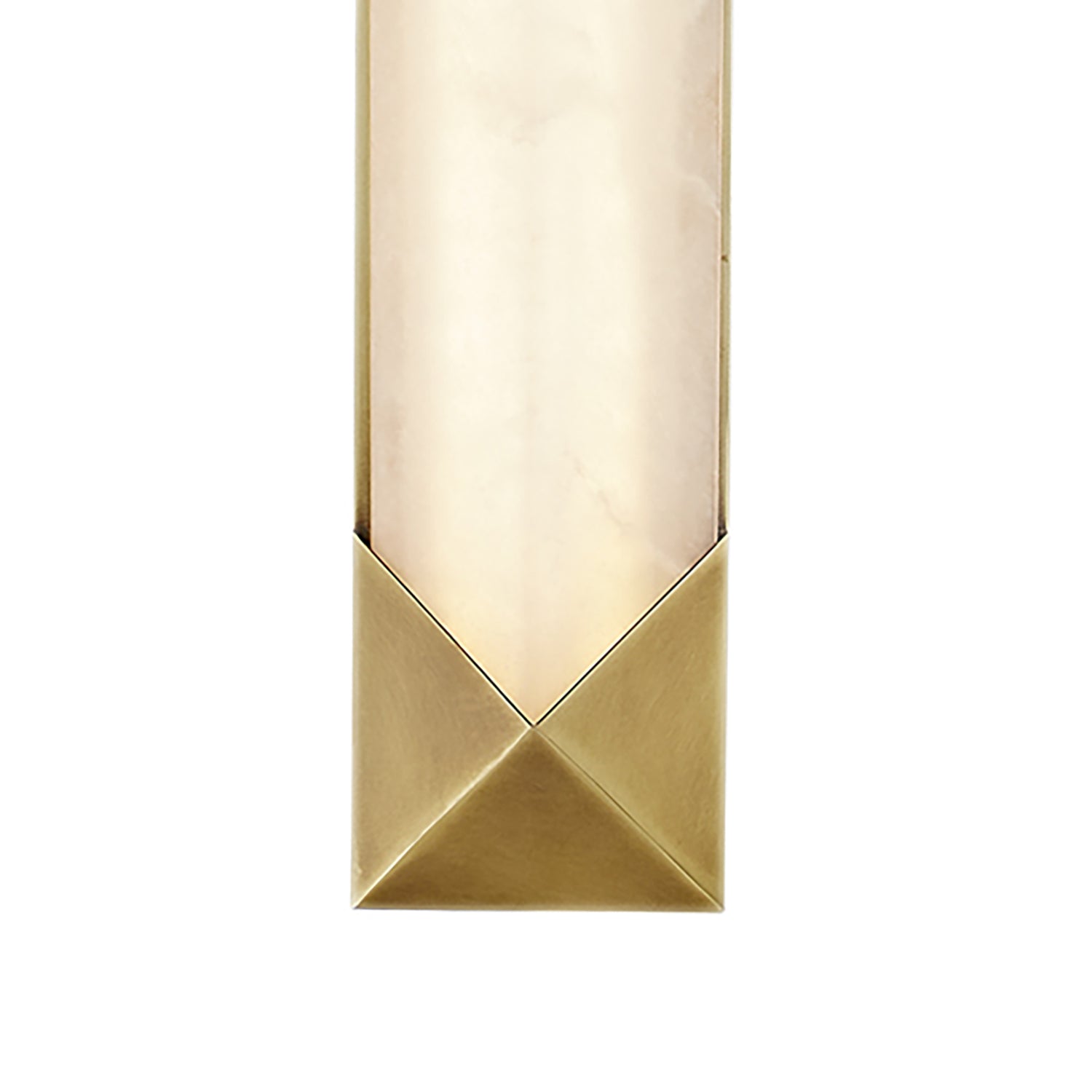 The Lunaire LED Wall Sconce brings sophisticated elegance to any interior space with its bold crystalline forms and distinctive angular design. This captivating fixture is truly jewelry for a space, featuring a diamond-like alabaster shade crafted from natural stone that gracefully adorn a structured aged brass base. The distinctive crystalline silhouette creates a stunning visual impact, perfect for hallways, bedrooms, bathrooms, and interiors seeking statement lighting with luxurious appeal. The integrated LED technology provides warm 3000K illumination at 90 CRI through the beautiful alabaster, producing exceptional color rendering that highlights the stone's unique veining and natural variations. At 25" high with ADA-compliant design and compact extension, this wall sconce makes a dramatic statement that brings crystalline beauty and refined lighting to any interior. Each alabaster shade boasts distinct variations in both veining and tone, ensuring no two pieces look exactly the same.