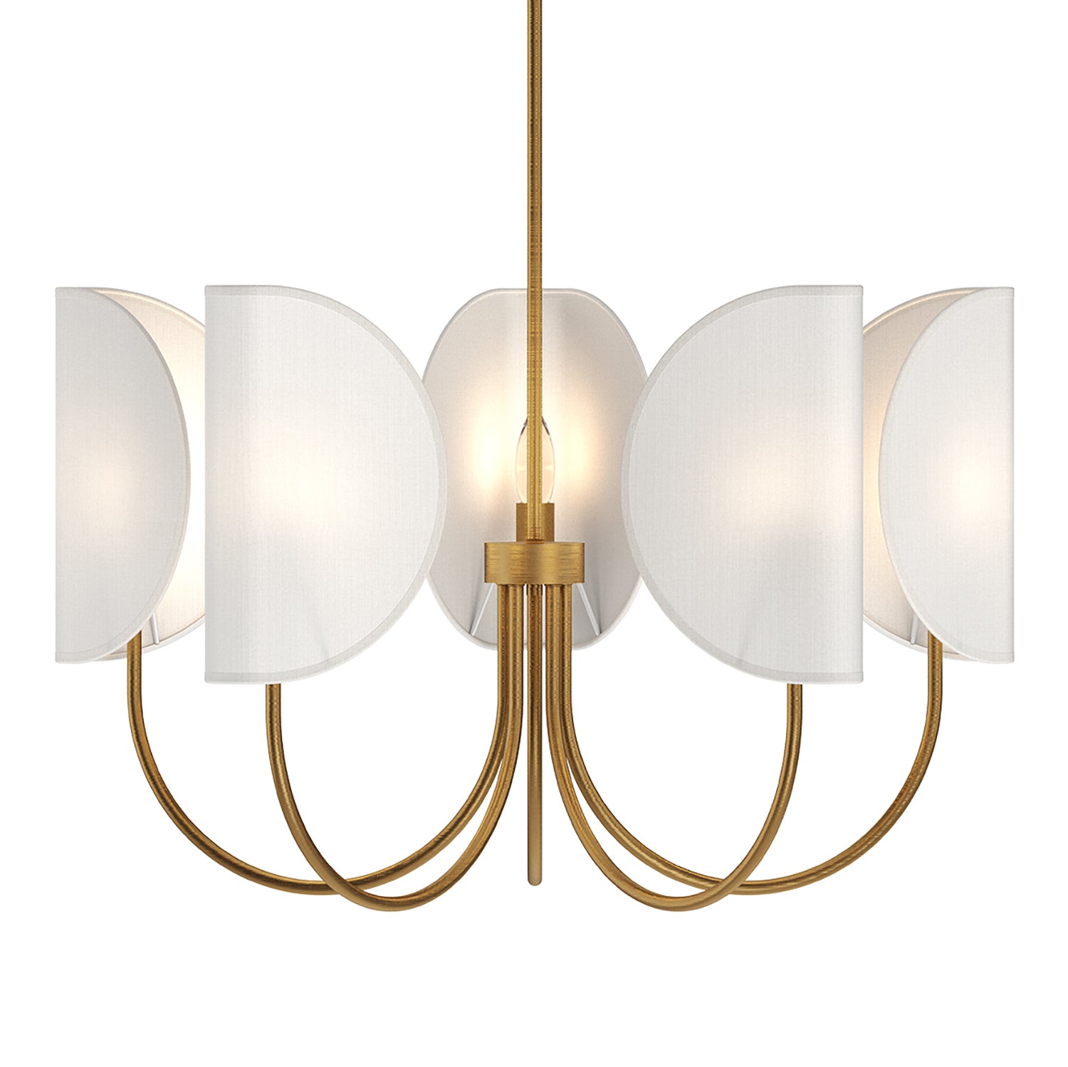The Nico 5 Light Chandelier features a sculptural design with soft, curved white fabric shades in a warm Antique Brass frame. This elegant ceiling light showcases five petal-like elements arranged around a central column, creating a contemporary silhouette with architectural appeal. The delicate fabric shades softly filter and diffuse light upward and downward, creating a warm, ambient glow in your space. Measuring 32" in diameter, the Nico makes a refined statement over dining tables, kitchen islands, or in entryways. The combination of soft fabric shades and antique brass hardware brings a touch of sophistication to any room, while the unique shade design adds visual interest and modern character.