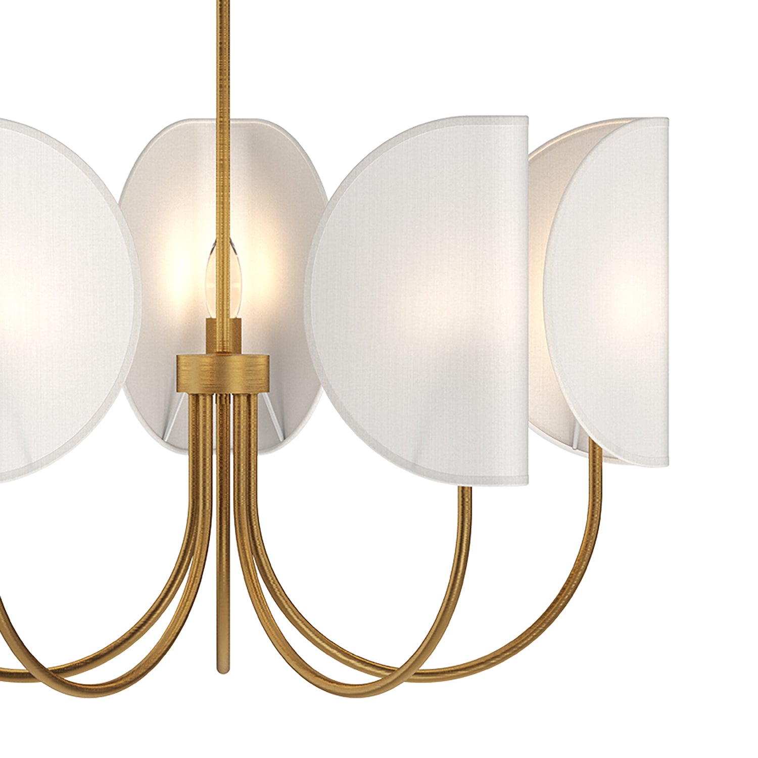 • Nico features five curved Antique Brass arms, topped with petal-like folded white fabric shades with matching hardware