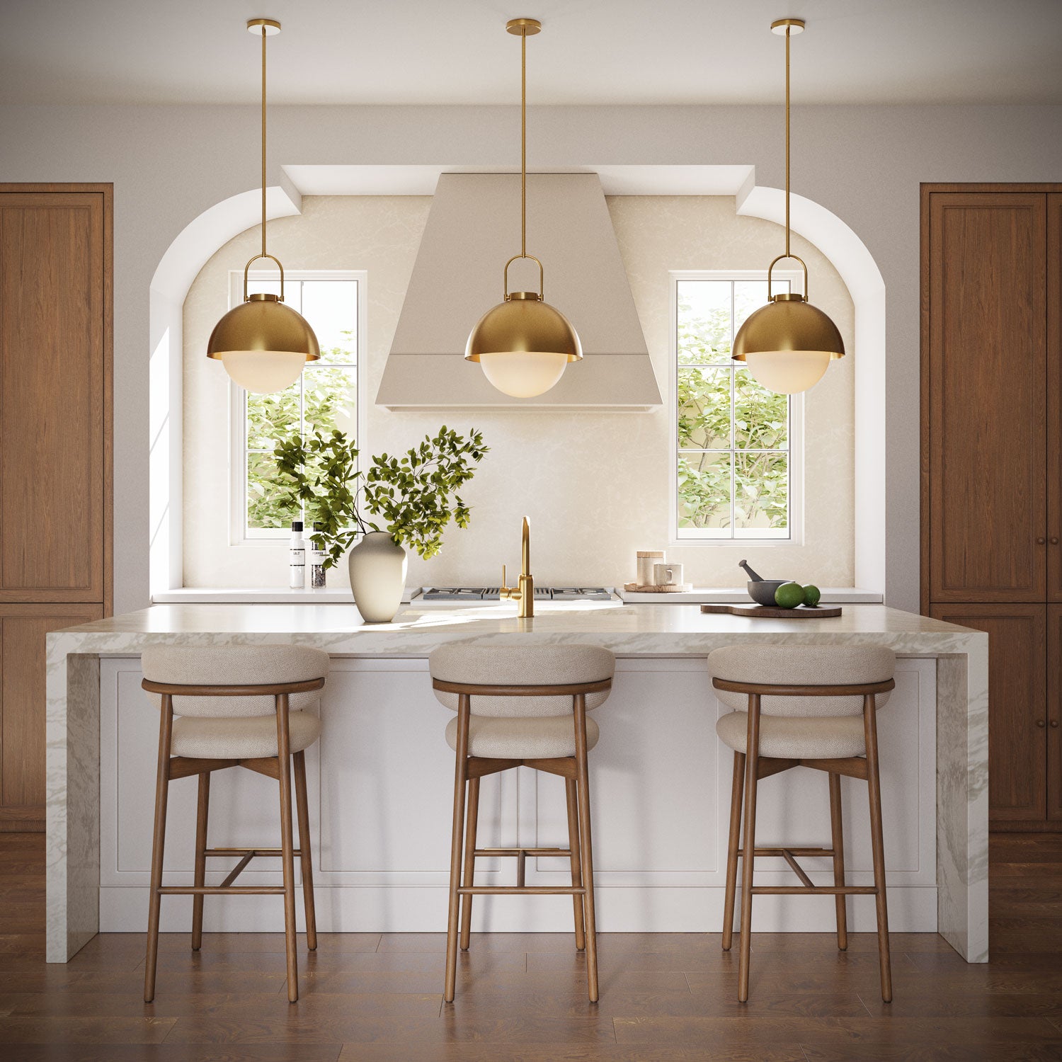 The Solene Pendant brings refined mid-century elegance to interior spaces with its distinctive globe design. This sophisticated fixture features a half-dome antique brass shade that seamlessly transitions to a smooth opal glass diffuser, creating a beautiful balance of metal and glass. The graceful arch handle and slender rod suspension add architectural interest while maintaining clean lines. When illuminated, the pendant provides both direct downward light and a soft ambient glow that creates inviting illumination perfect for dining areas, kitchen islands, or entryways. The warm antique brass finish adds timeless appeal that complements a wide range of interior styles from contemporary to transitional. With its perfectly proportioned silhouette and mixed-material construction, the Solene pendant makes a sophisticated statement while providing beautiful functional lighting.