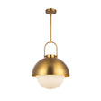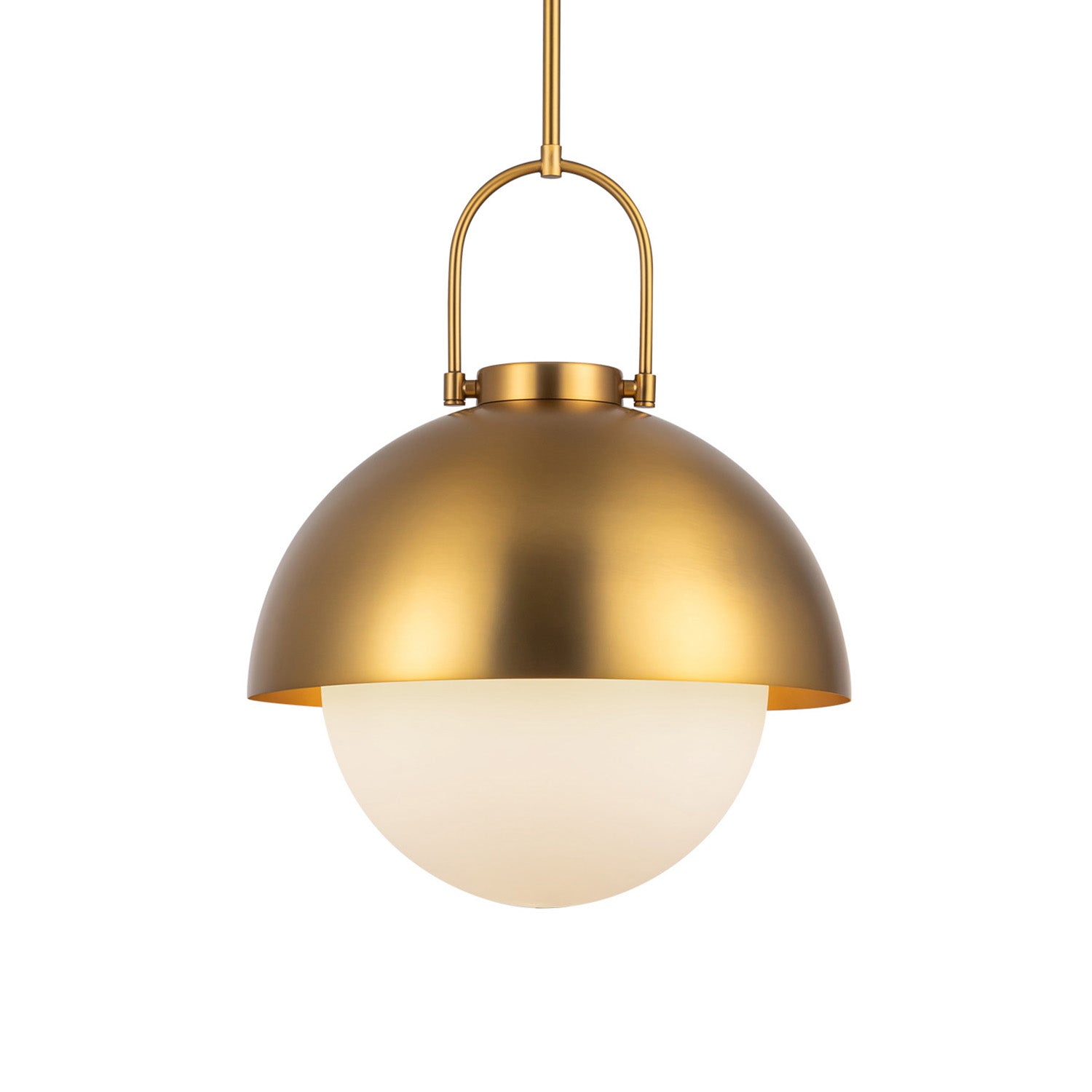 • Mid-century inspired pendant with antique brass dome and details, and opal glass diffuser