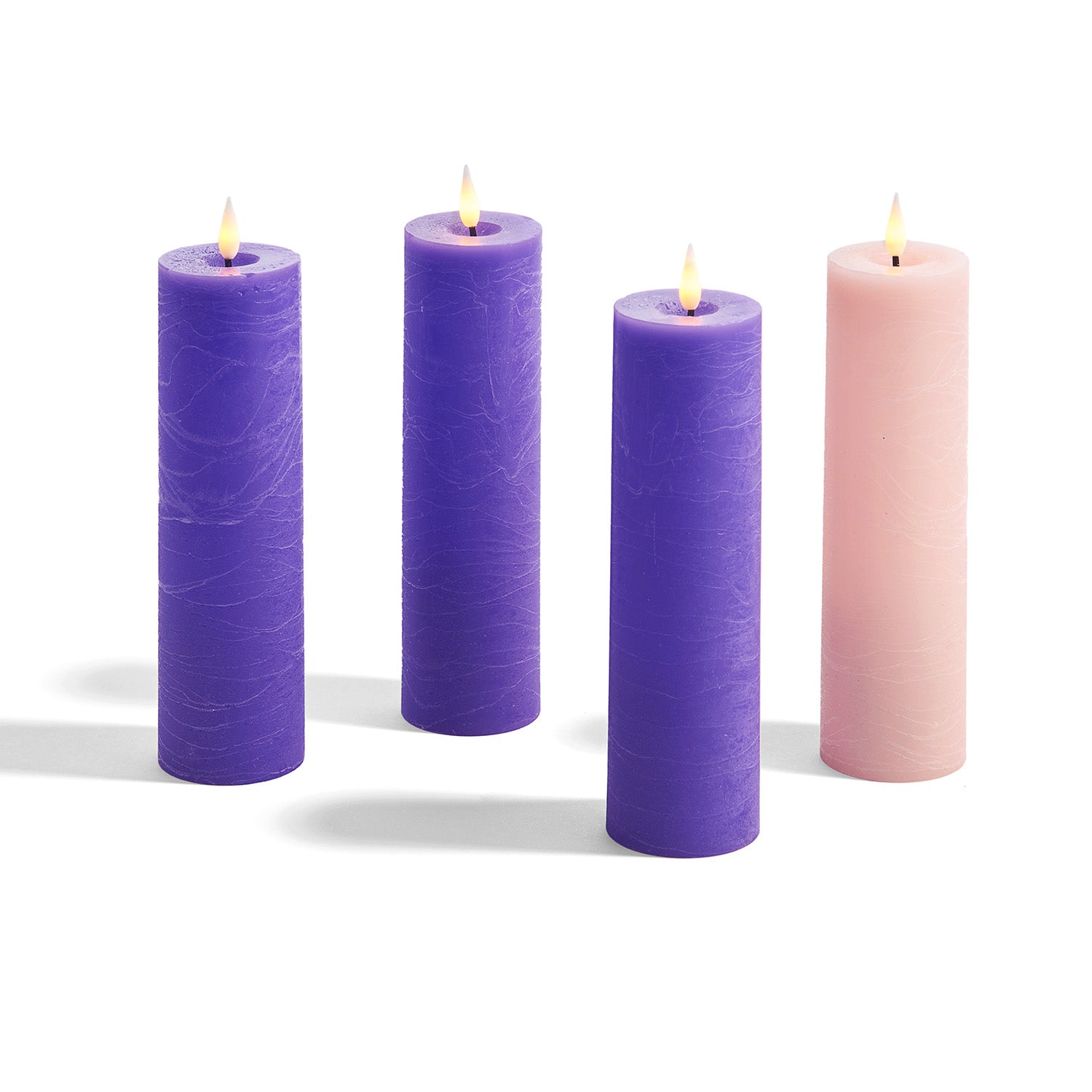 This set of four flameless slim pillar candles is a perfect addition to your devotional Christmas decor. Much safer and less messy than old-fashioned candles, these are a beautiful and convenient way to observe Advent, lighting one candle each Sunday for the four weeks leading up to Christmas Day. Use the remote control to set the candles on a four or eight-hour timer; the candles will light each night at the same time and turn themselves off at the end of the night. Each candle can be set separately- making this set perfect for a traditional Sunday ceremony at home or at church. Light one more candle each of the four Sundays before the birth of Christ- a joyful family tradition.
