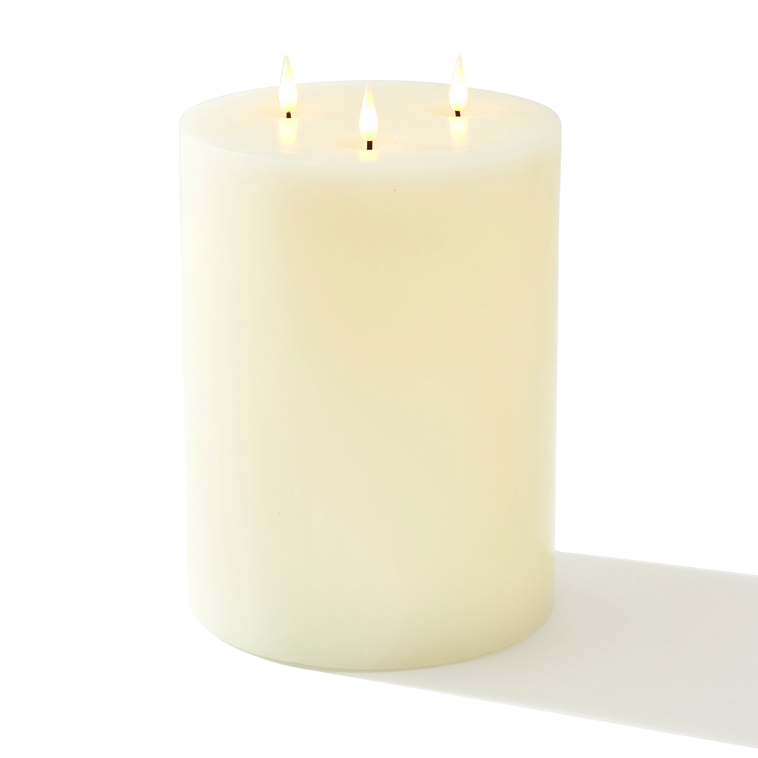 This candle is a showstopper. At six inches wide and eight inches tall, this striking candle deserves to be the center of attention. The candle features three of our ultra-realistic Infinity Wick flames at the top and comes with a convenient six-button remote control. This candle is a beautiful, versatile addition to any decor, boasting a real wax exterior finished in a classic ivory color. The sophisticated flat-top design, included optional timer, and beautiful present-ready packaging make this Infinity Wick Candle an ideal gift for Christmas, housewarming, or for the newlyweds in your family. Create a dining room centerpiece by adding botanicals around this candle, or place it on a mantel or side table for a little extra glow. Perfect for home, weddings, churches, restaurants, and events.