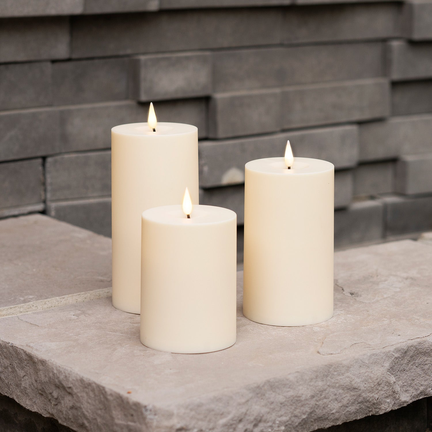 This set features three outdoor battery-operated flameless pillar candles with a 3" diameter and staggering heights.  Made with durable resin in a luxe matte ivory finish, these weather-resistant candles are designed for backyard glamour. These outdoor lights add effortless highlights to your porch, garden, or patio; no wiring or installation required. Use the included remote control to set the timer to 4 or 8 hours, or change from flicker to steady light. Use these charming candles to cheer up dark planters, set a romantic mood in outdoor dining spaces, or place on the front stairs for a little extra visibility.