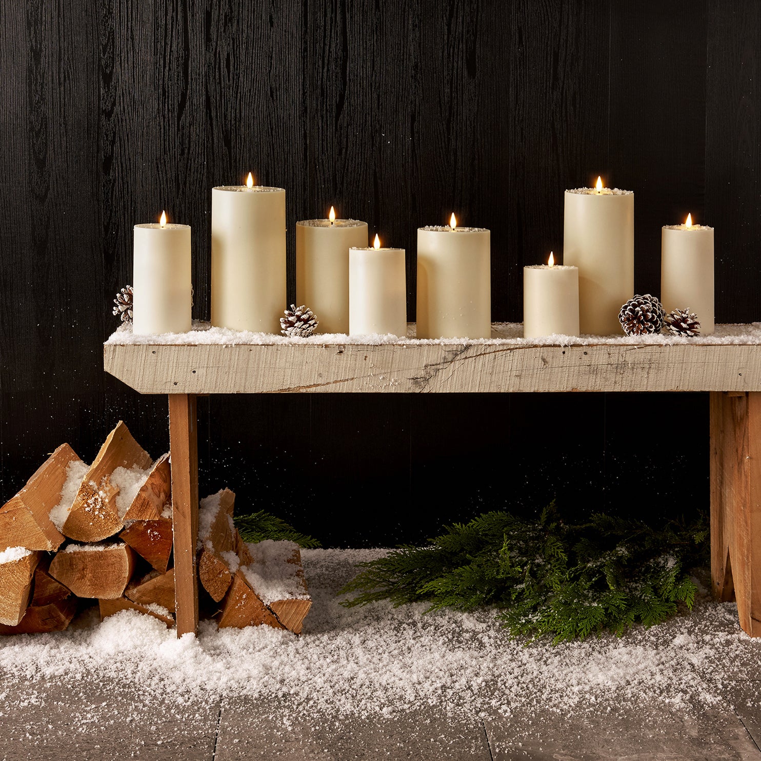 • Three outdoor flameless candles measuring 3"x4", 3"x5", and 3"x6", featuring our distinctive and ultra-realistic Infinity Wick flame