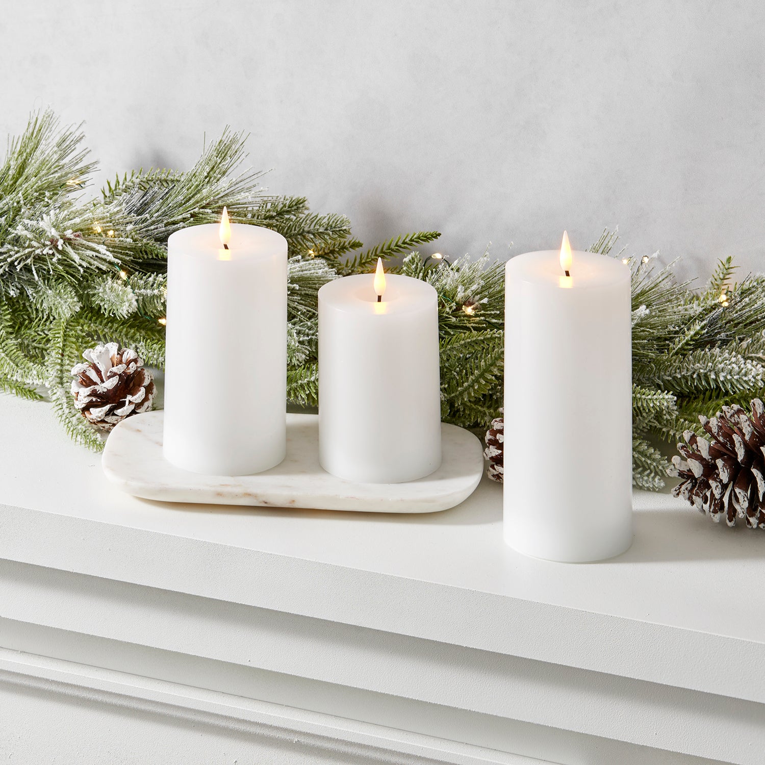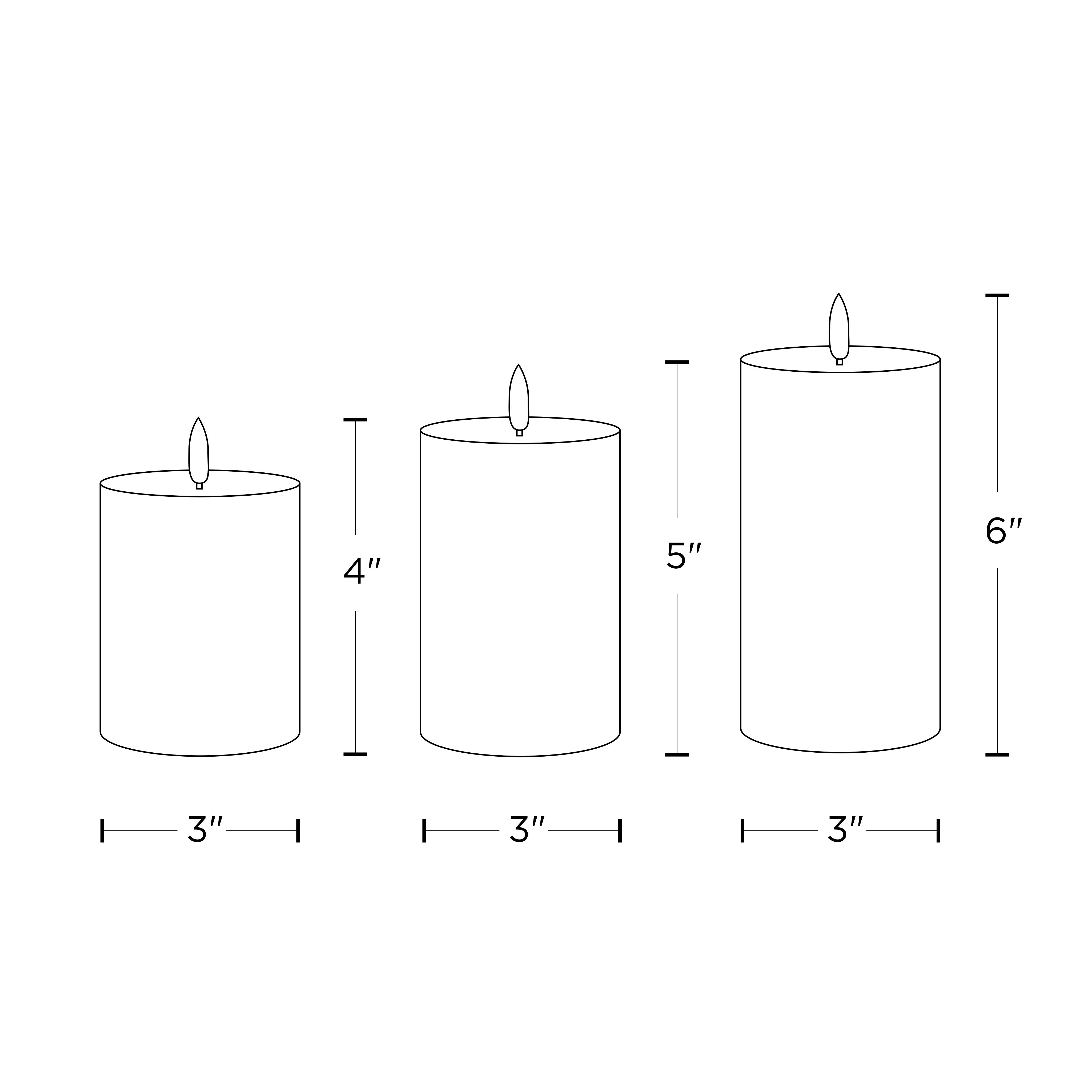 • Three flameless candles with a 3" diameter and staggered heights, featuring our distinctive and ultra-realistic Infinity Wick flame - Remote included