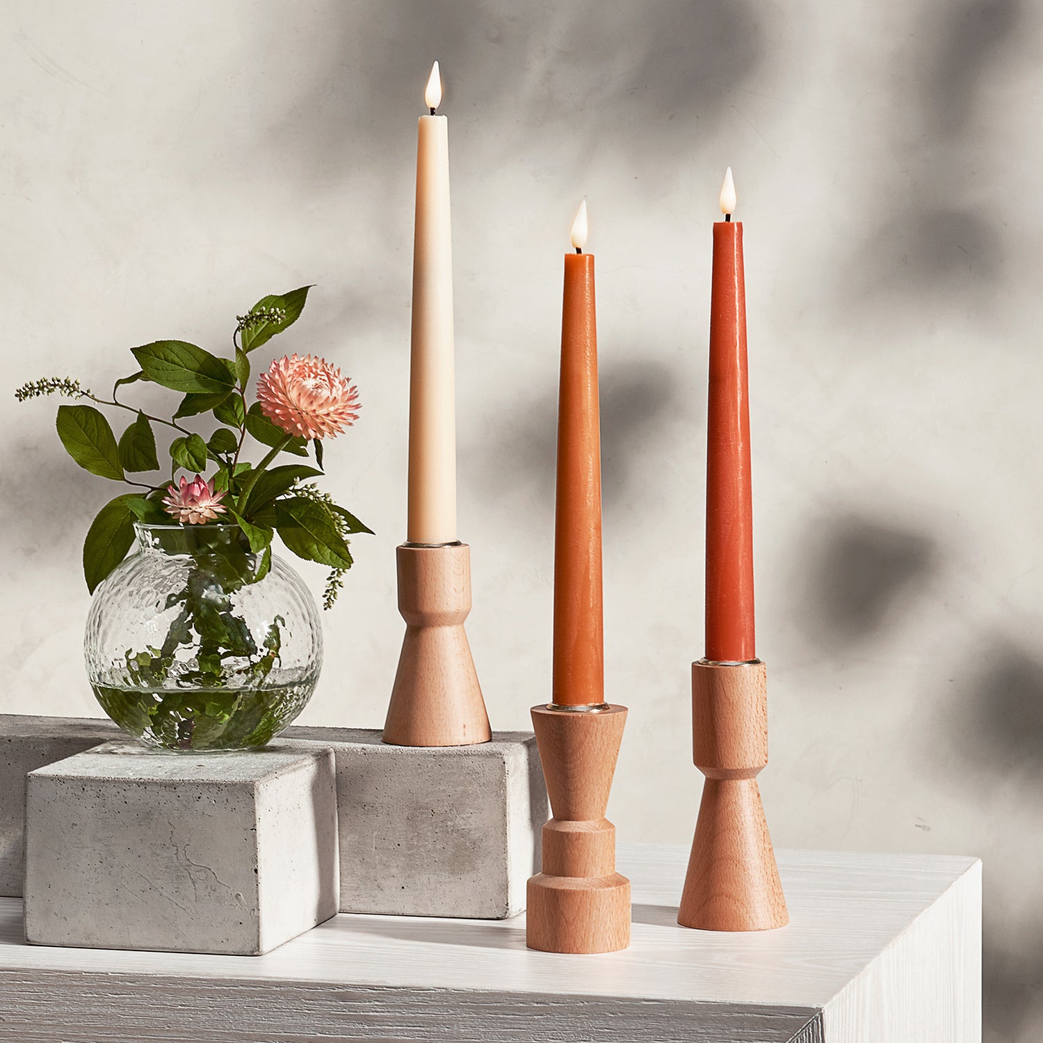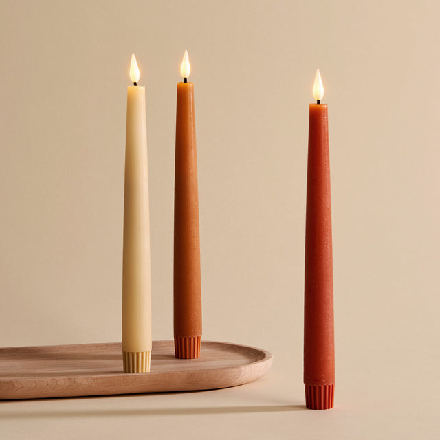 This candle set includes three elegant candles in neutral warm colors, topped with our distinctive Infinity Wick LED flames. Each candle in the pack is a different color, creating a gradient ombre effect when the candles are set together. These battery-powered taper candles are a beautiful, versatile addition to any style of decor, boasting a real wax exterior finished with a unique, distressed texture. Our Infinity Wick tapers fit most standard candle holders, come with a convenient remote control, and arrive in beautiful giftable packaging, making them an ideal holiday or housewarming gift. Place among botanicals to accentuate a floral centerpiece and elevate any dinner table, or add them to your everyday decor for a fun pop of color. Perfect for home, weddings, holidays, and special events.