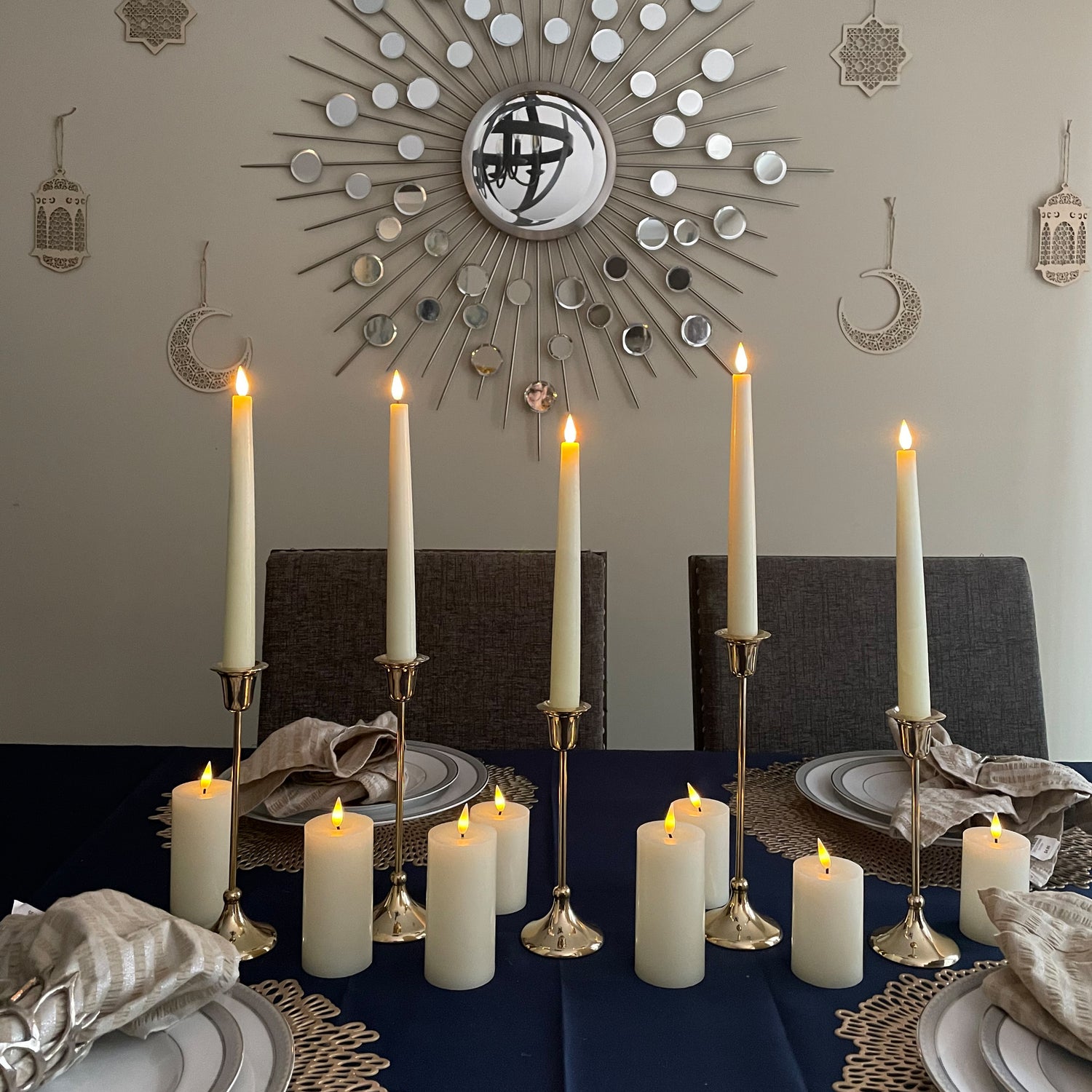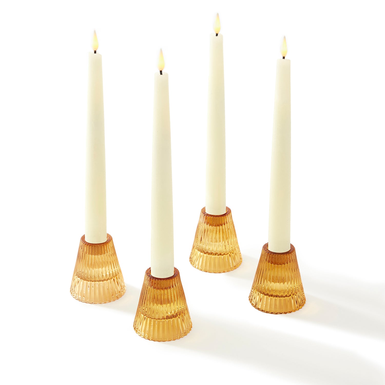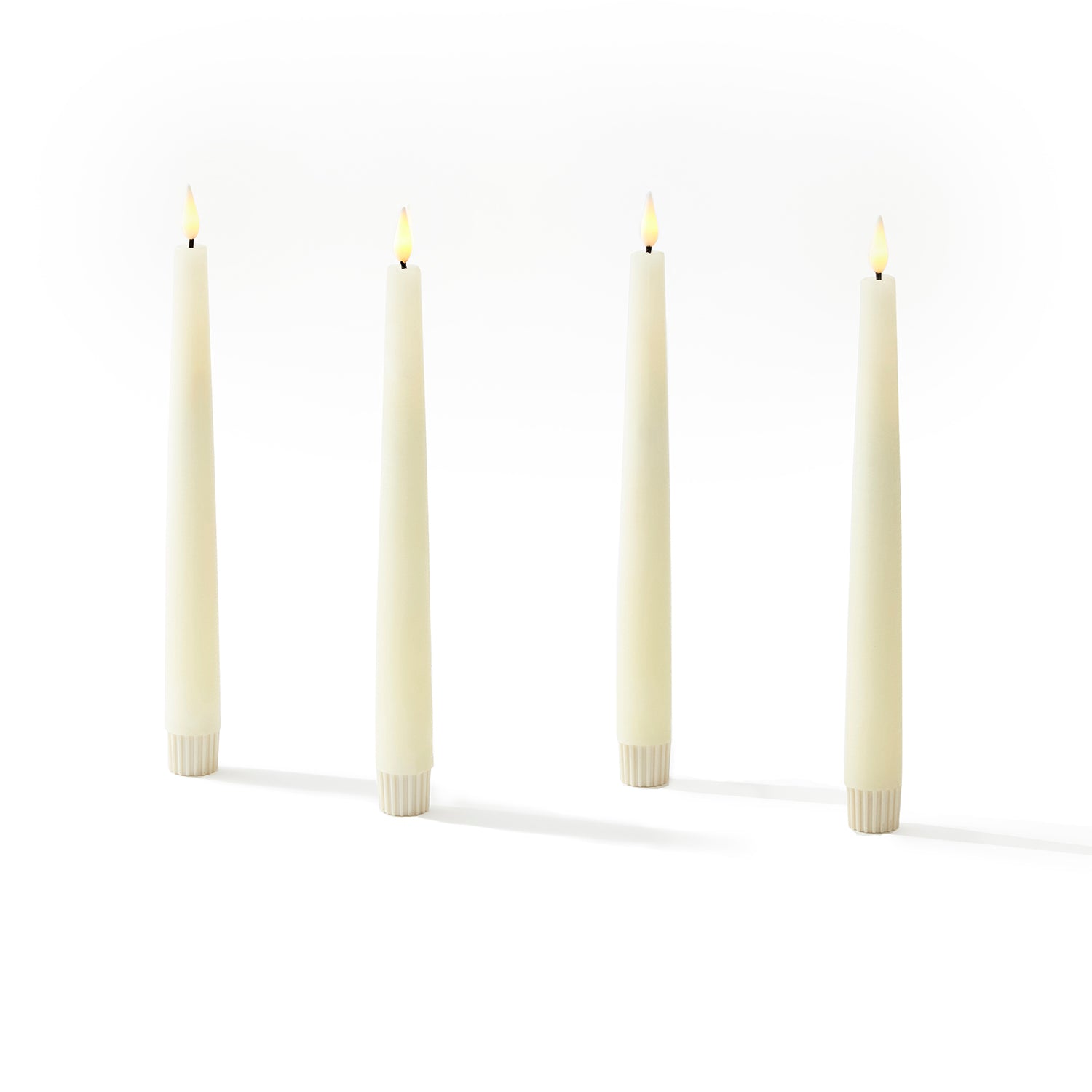 • Four flameless taper candles measuring .75" in diameter and 9" in height, featuring our distinctive and ultra-realistic Infinity Wick flame