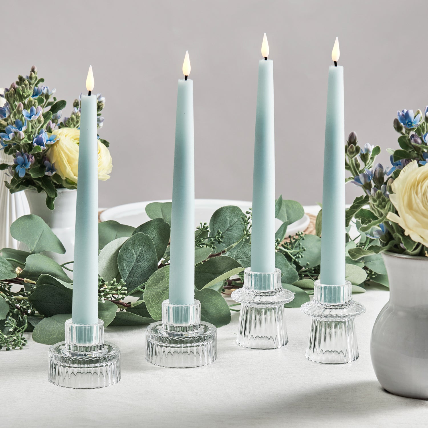 This candle set includes four elegant, soft blue candles featuring our distinctive Infinity Wick flames. These taper candles are a beautiful, versatile addition to any style of decor, boasting a real-wax exterior finished with a unique, distressed texture and cheerful pastel blue hue. These tapers will fit most standard candle holders, and the included remote with timer make these Infinity Wick Candles an ideal gift for Mothers' Day or housewarming. These pretty, dusty blue candles are perfect for baby showers, Easter brunch, or even a spring or summer dinner party. Place among botanicals to accentuate a floral centerpiece to elevate any dinner table. Perfect for home, weddings, churches, restaurants, and events.