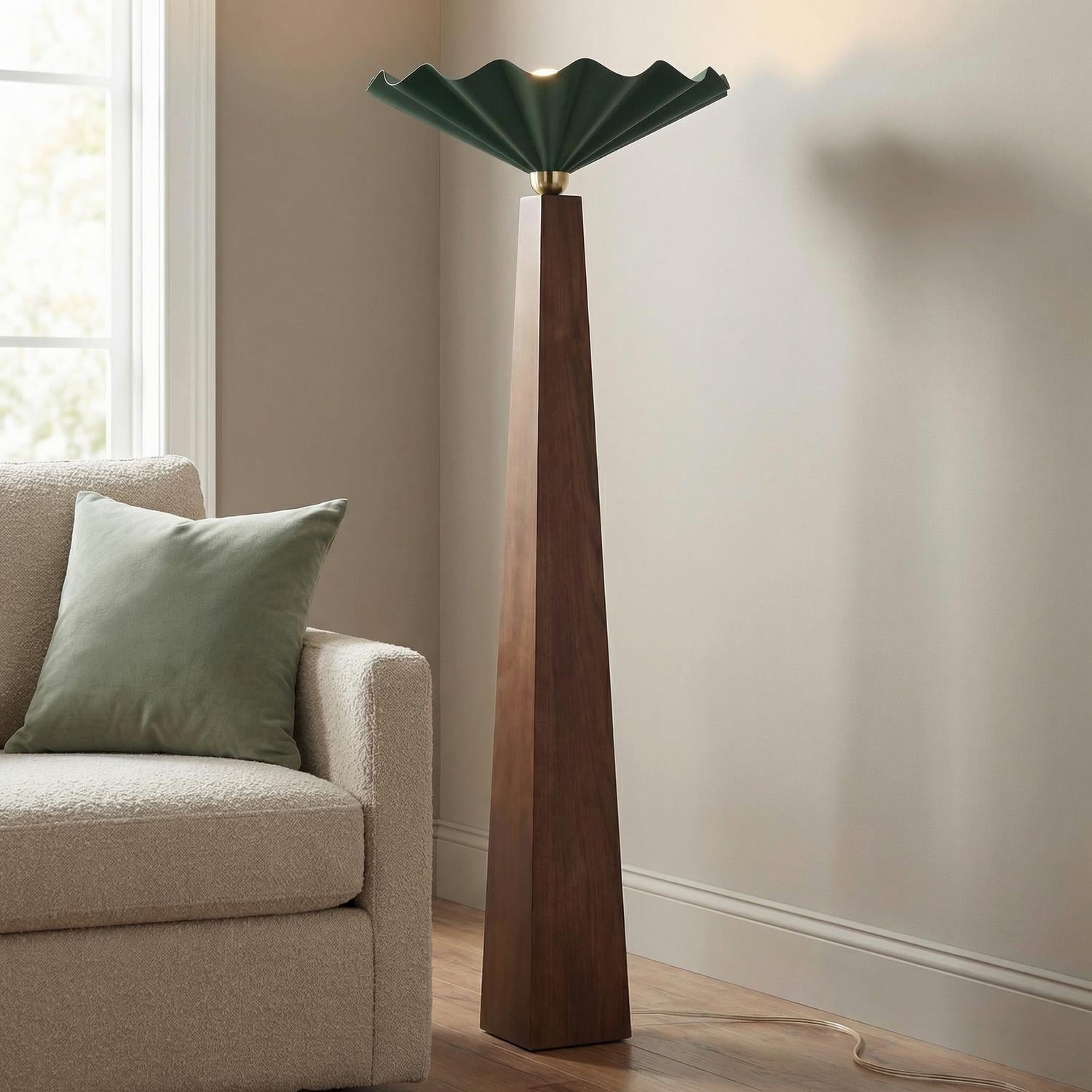 The Babette Floor Lamp 65", Hunter Green and Walnut celebrates the beauty of rarity and form. This fixture features an oblong, pearl-like opal glass diffuser nestled within a ruffled metal “shell” finished in a rich hunter green and anchored by a tall walnut wood base. By combining whimsical, fan-like geometry with natural wood textures and classic lighting elements, the Babette serves as a uniquely expressive focal point that transforms floor lighting into a sculptural art piece. Its playful yet sophisticated form brings a vibrant pop of color and refined material contrast to modern interiors, creating a visually striking atmosphere without unnecessary clutter.