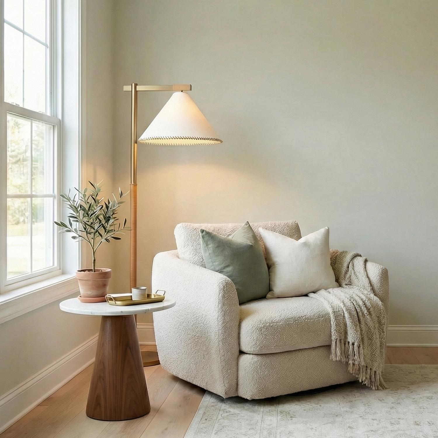 The Delora Floor Lamp 60" strikes a masterful balance between organic texture and polished hardware, redefining the classic conical silhouette with artisanal details. A white linen shade serves as the focal point, emitting a soft, ambient glow that brings an inviting warmth to any interior space. The design is elevated by a Patina Brass frame featuring hand-wrapped jute accents and contrasting whip-stitching along the shade's edge, adding layers of tactile depth to the form. This versatile statement piece pairs a sophisticated metallic finish with natural materials, making it a perfect addition to reading nooks, bedrooms, or contemporary living rooms.