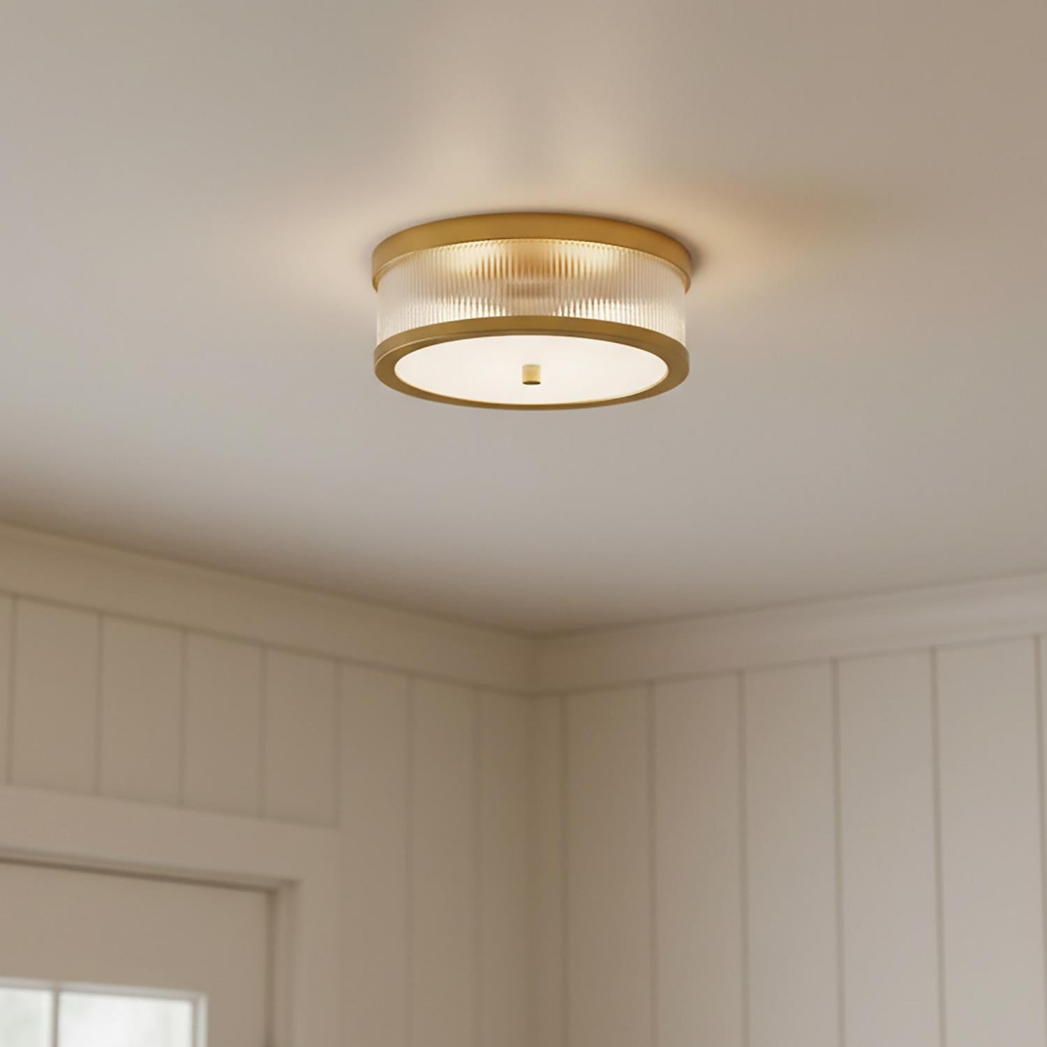 The Barclay Flush Mount makes a sophisticated statement with its elegant, low-profile design. Its clean, circular form and clear fluted glass shade deliver a refined look that is anchored by a strong, central band. The fixture is thoughtfully designed to cast a unique, diffused glow, providing ample illumination for a hallway, bedroom, or bathroom. With its ETL damp rating, it adds both functional beauty and versatile appeal to any interior. The beautiful Modern Brass finish brings a warm metallic richness that enhances the fixture's elegant silhouette. This striking flush mount is a perfect blend of style and functionality, adding a touch of refined elegance to your interior.