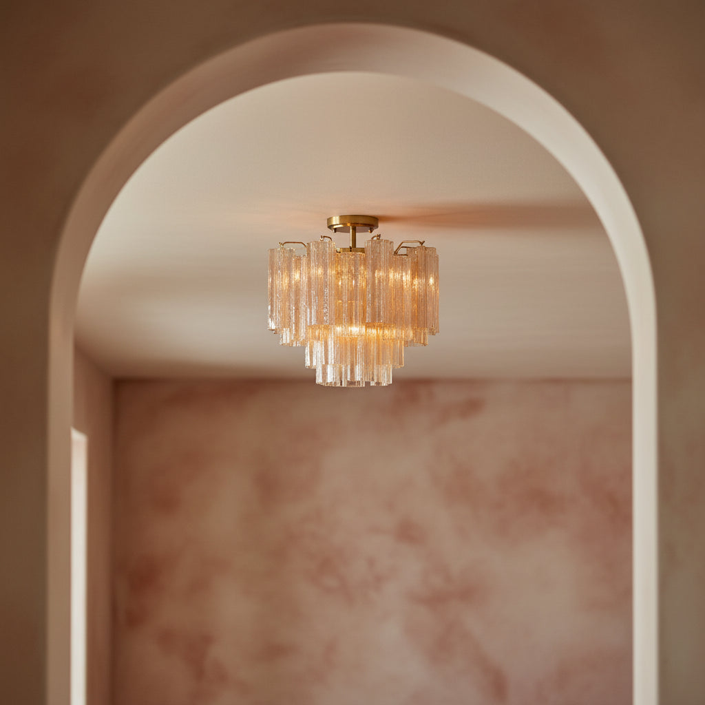 The Grace Semi-Flush in 18" brings sophisticated elegance to spaces with lower ceilings through its stunning combination of rich brass finish and luminous topaz textured Tronchi glass. This elegant fixture features cascading textured glass tubes arranged in a tiered formation that creates beautiful light diffusion while adding visual interest to dining rooms, living areas, and foyers. The warm brass framework provides structural elegance, while the warm topaz glass delivers soft, evenly distributed illumination that enhances spaces with luxurious ambiance. At just under 18" in diameter with 4 light sources, this semi-flush mount delivers substantial presence and ample illumination, perfectly scaled for rooms with standard ceiling heights. The multi-panel glass design creates captivating shadows and light patterns, making it an ideal centerpiece for sophisticated interiors.
