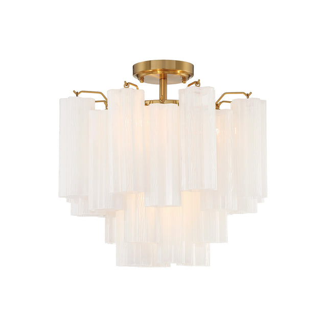 The Grace Semi-Flush in 18" brings sophisticated elegance to spaces with lower ceilings through its stunning combination of rich brass finish and pristine white textured Tronchi glass. This elegant fixture features cascading textured glass tubes arranged in a tiered formation that creates beautiful light diffusion while adding visual interest to dining rooms, living areas, and foyers. The warm brass framework provides structural elegance, while the crisp white glass delivers soft, evenly distributed illumination that enhances spaces with luxurious ambiance. At just under 18" in diameter with 4 light sources, this semi-flush mount delivers substantial presence and ample illumination, perfectly scaled for rooms with standard ceiling heights. The multi-panel glass design creates captivating shadows and light patterns, making it an ideal centerpiece for sophisticated interiors.