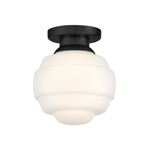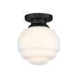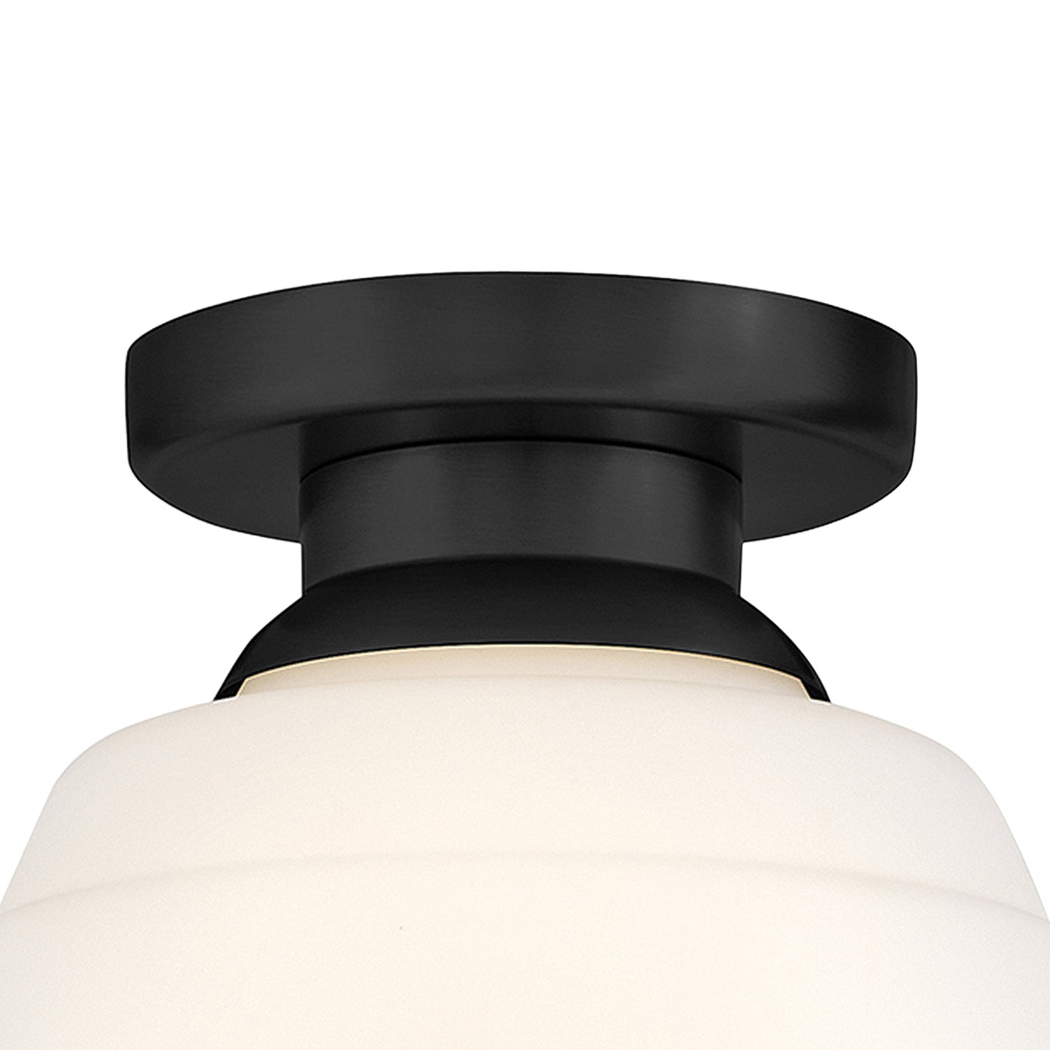 The Irving Small Flush Mount is a vintage industrial flush mount that makes a sophisticated statement with its clean, timeless silhouette. The smooth metal frame seamlessly anchors the opal glass shade to the ceiling, providing brilliant, diffused light for effective illumination. This flush mount light fixture is thoughtfully designed for low ceilings, making it an ideal choice for a kitchen, hallway, or laundry room. With its ETL dry rating, it offers both functional beauty and versatile appeal. The sleek Black finish unifies the fixture's bold, simple form, resulting in a look of enduring style and timeless elegance. This striking industrial light collection delivers enduring style and a perfect blend of elegance and simplicity.