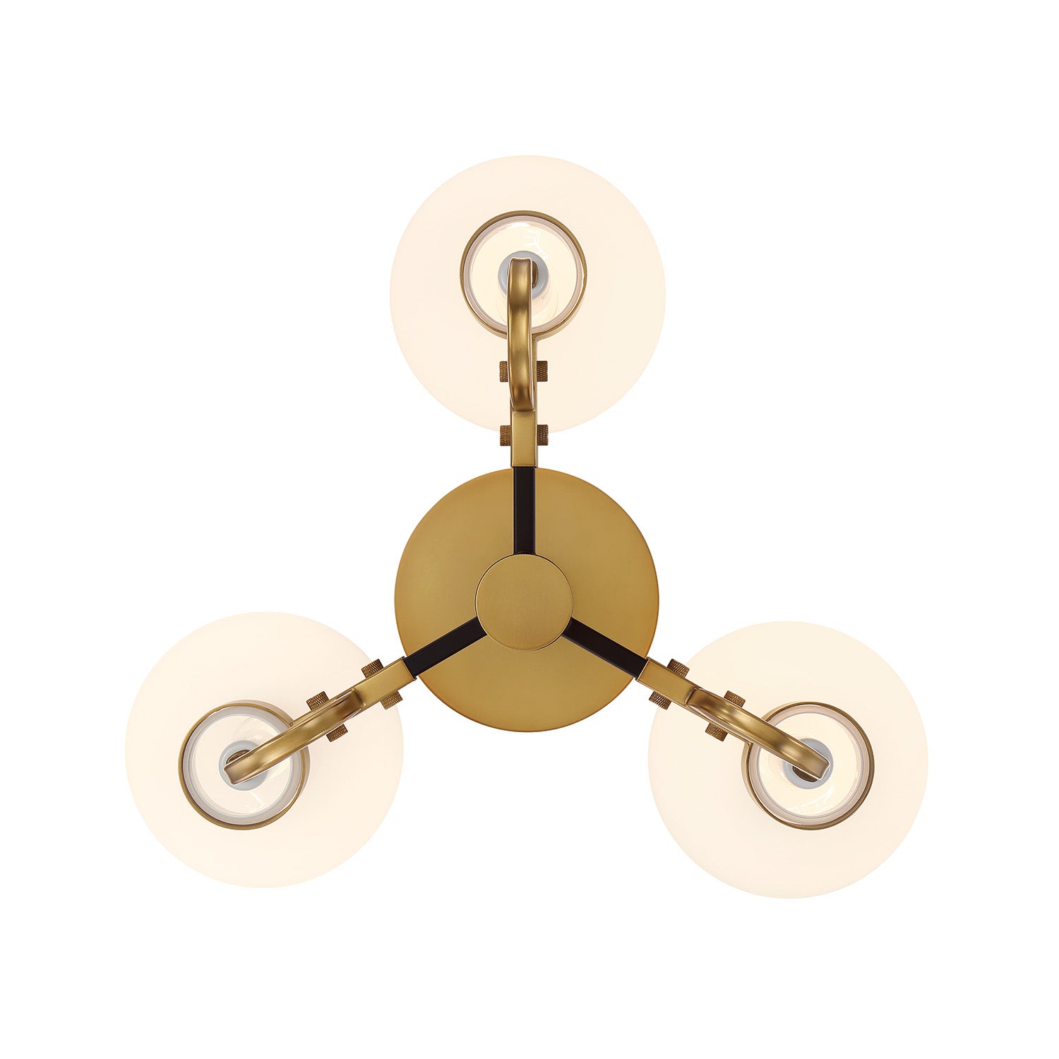 • Matte black and aged brass flush mount features three opal glass globes in a stylish modern industrial frame, with intricate knurling details on the center stem and thumbscrews