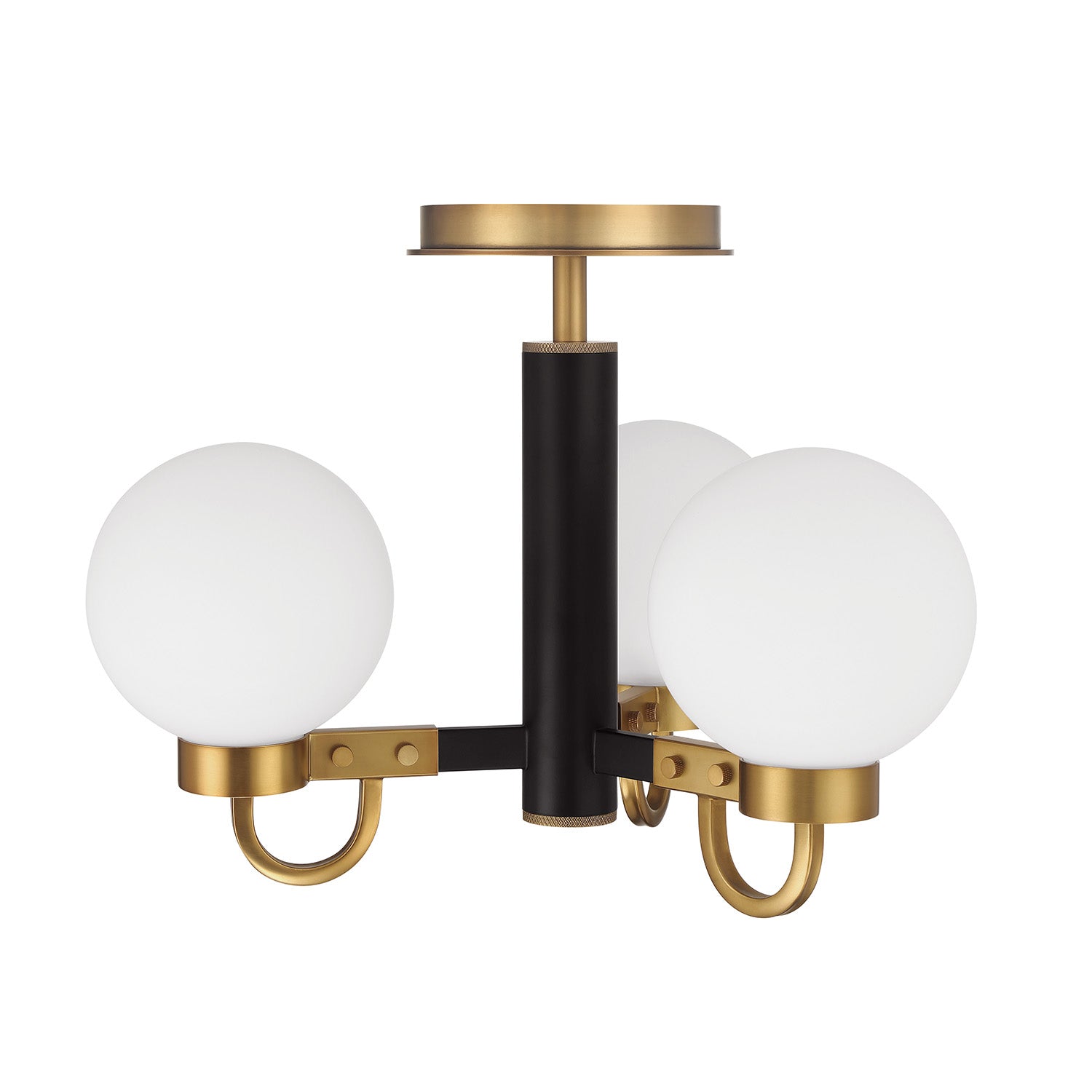 Modern and stylish industrial details abound in the extraordinary Ryan Flush Mount. This ceiling light displays on-trend dual metal contrasting matte black and aged brass finishes. Suspended from a brass canopy, three squared metal arms extend from the round center hub, with knurled detailing. Each arm is capped by unique brass detailing and knurled thumb screws. Perched on top of the arms rest beautiful white opal glass globes that soften the design. This light is perfectly sized at just under 18" wide and 12.5" tall for use as a semi-flush mount ceiling light; beautiful for hallways, bedrooms, a home office, or living spaces with lower ceilings.
