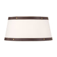 • Sleek, transitional flush mount ceiling light featuring a drum-shaped fabric shade and refined vegan leather accents