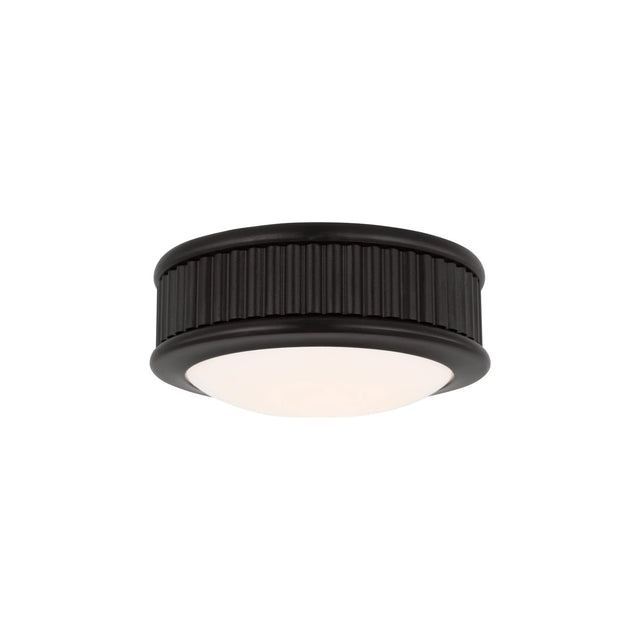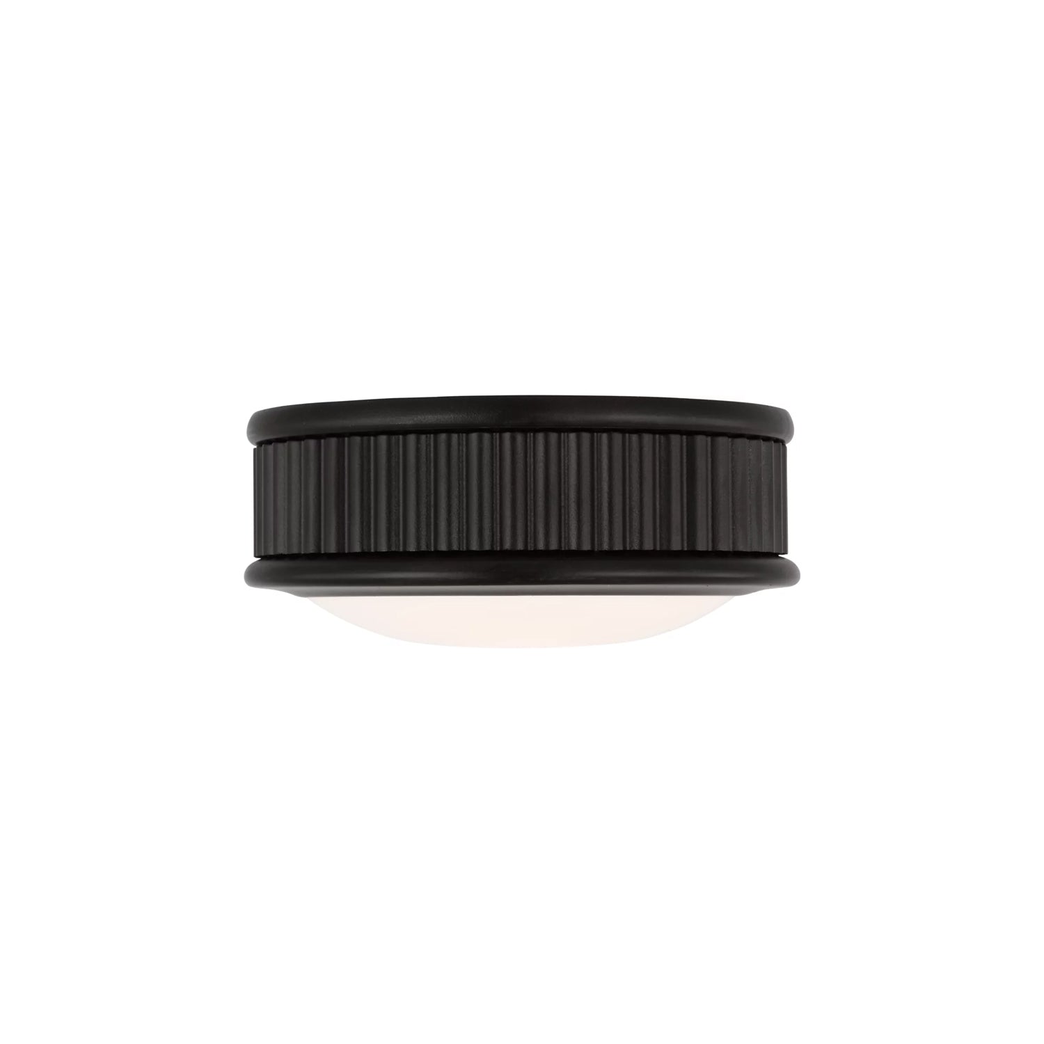 • Bishop features a slim LED flush mount defined by a milk glass shade and a ribbed, aged iron steel frame