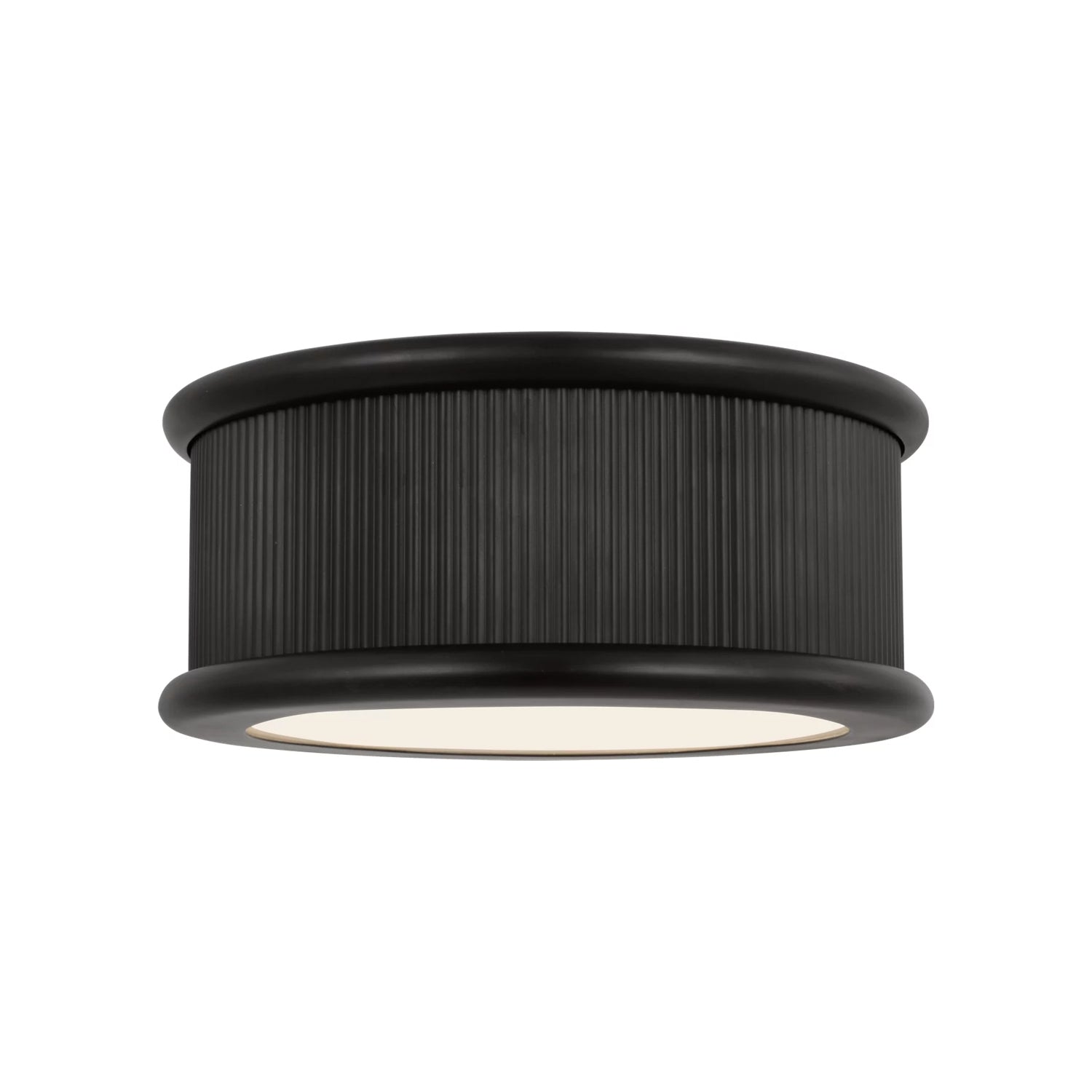 • Bishop features a slim-profile flush mount defined by a frosted glass shade and a ribbed, aged iron steel frame