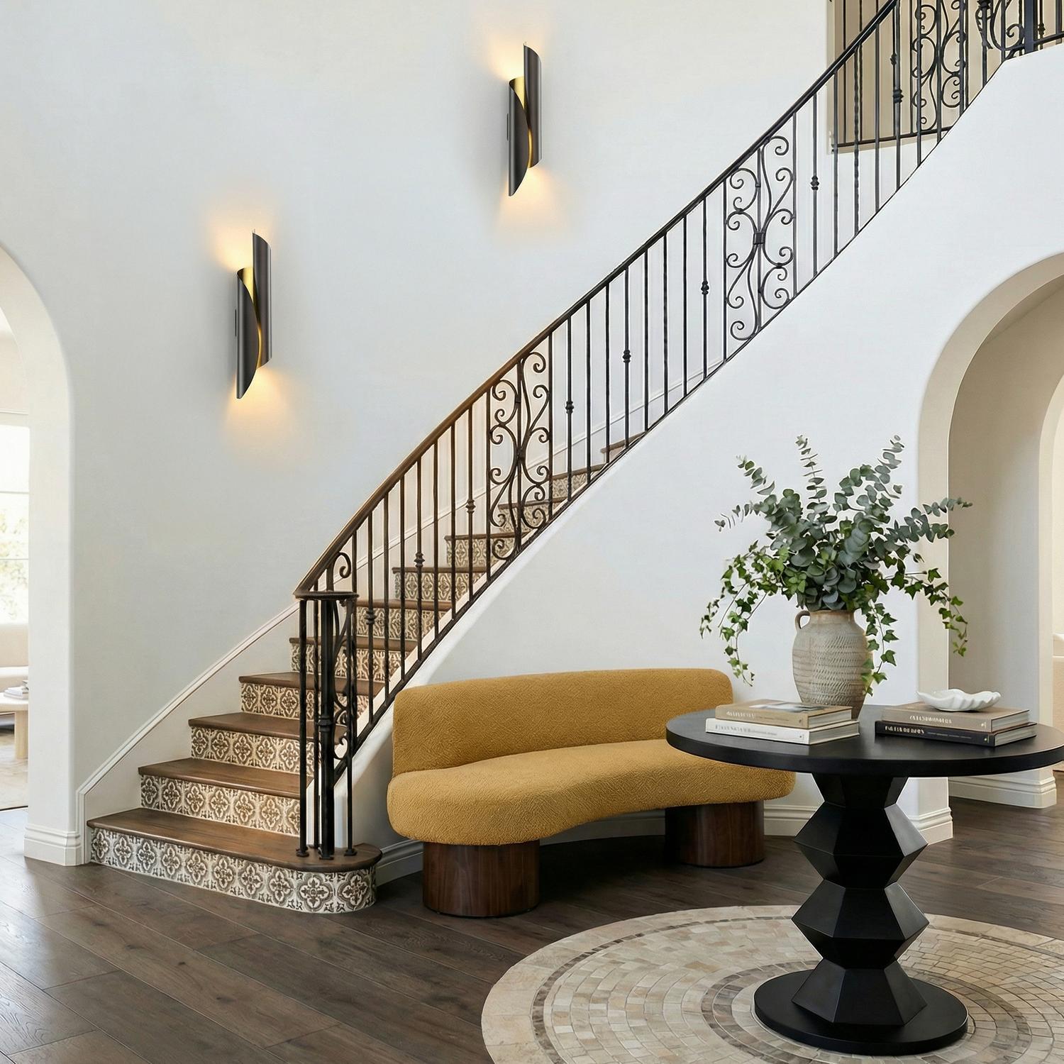 The Isla Wall Sconce brings artistic sophistication to your walls with its elegant wrapped design. This striking fixture features a gracefully curved metal form inspired by unfurling scrolls, creating a sculptural silhouette that doubles as a piece of wall art. The rich, urban bronze exterior provides a bold contemporary presence, while the hand-painted brushed gold interior creates a warm, radiant glow as light reflects within its curved surface. At an impressive 26 inches tall, this vertical sconce makes a dramatic statement in entryways, living spaces, or flanking architectural features. The interplay between light and shadow highlights the sconce's dimensional curves, adding depth and visual interest to any wall.