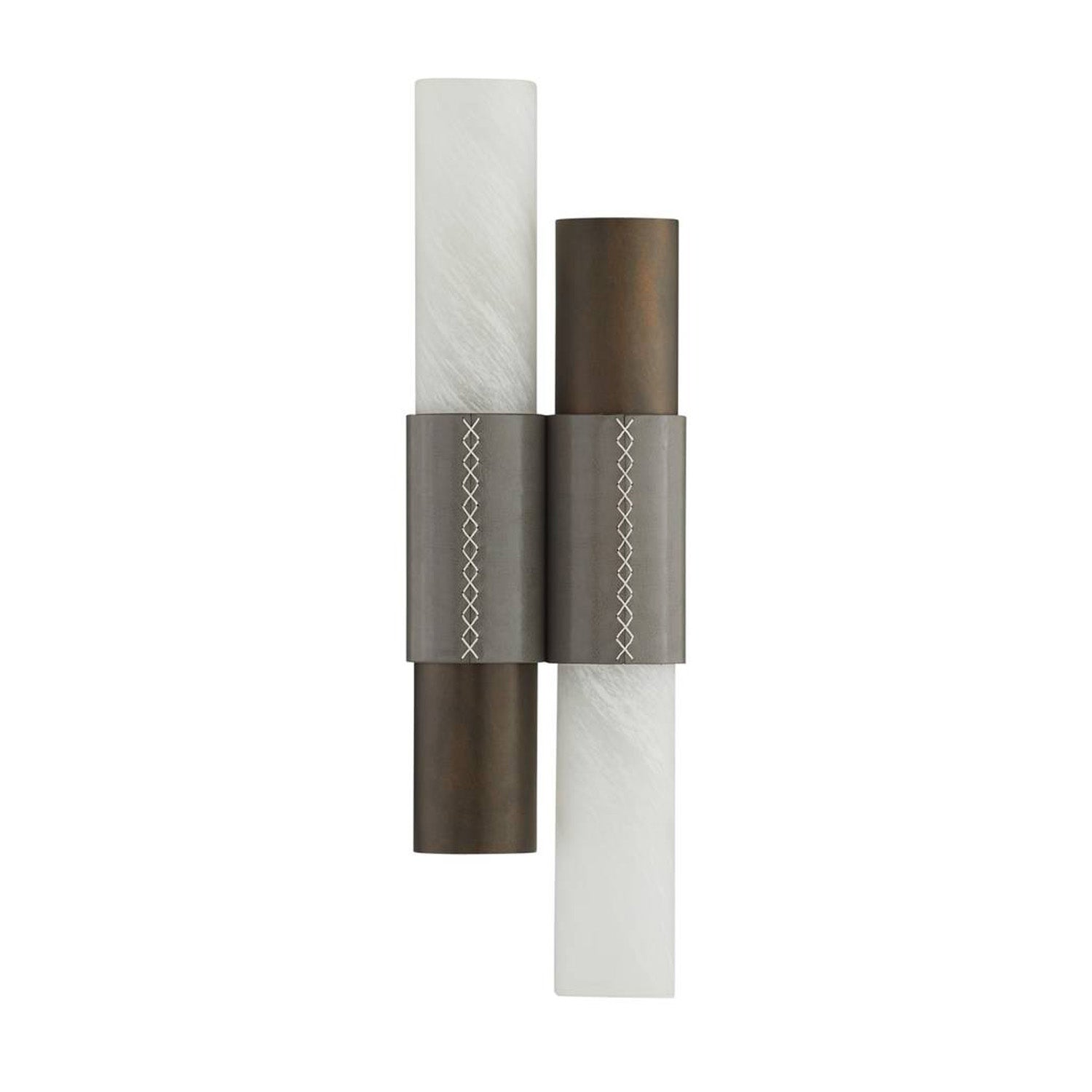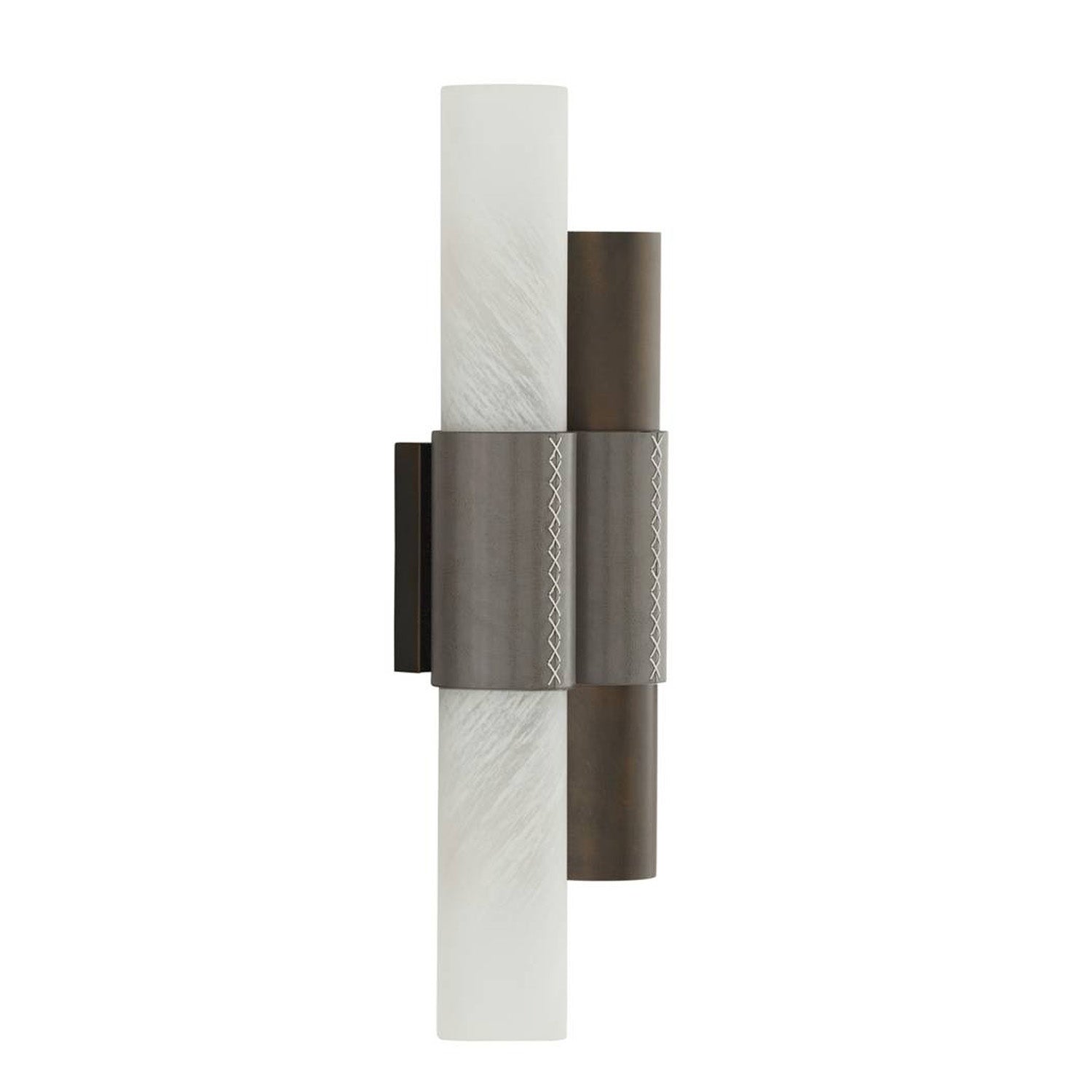 The Rainier Wall Sconce introduces a refined industrial aesthetic to your interior walls. This innovative fixture features interchangeable cuffs of swirled art glass and English bronze-plated steel, allowing for a customizable play between transparency and solid metal. The design is elevated by bands of topstitched charcoal leather that wrap the central frame, adding a tailored, high-end edge to the rugged materials. This combination of artisan glass, rich leather, and dark bronze creates a balanced look that grounds your space with modern sophistication. This fixture is an ideal choice for bringing a layer of warm light to a home office, adding character to a transition hallway, or flanking a vanity in a contemporary powder room.