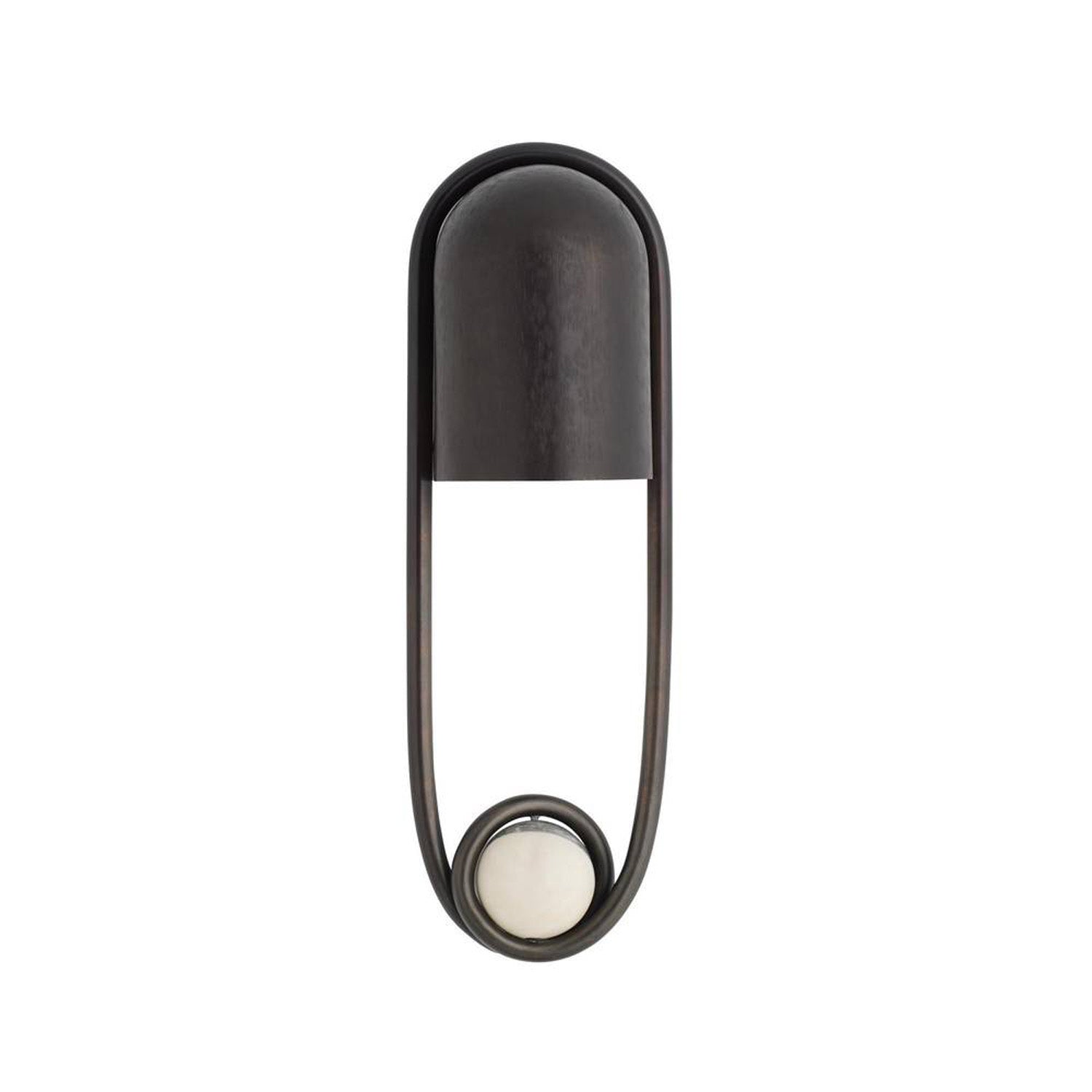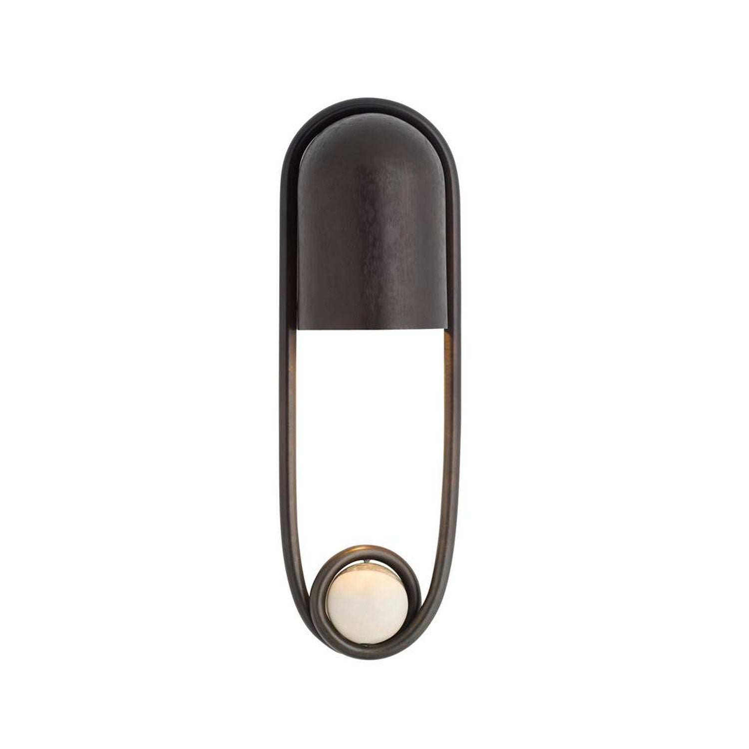 • Bastion features a sculptural wall sconce silhouette defined by a stirrup-shaped English bronze frame, a rounded metal hood, and a marble orb accent
