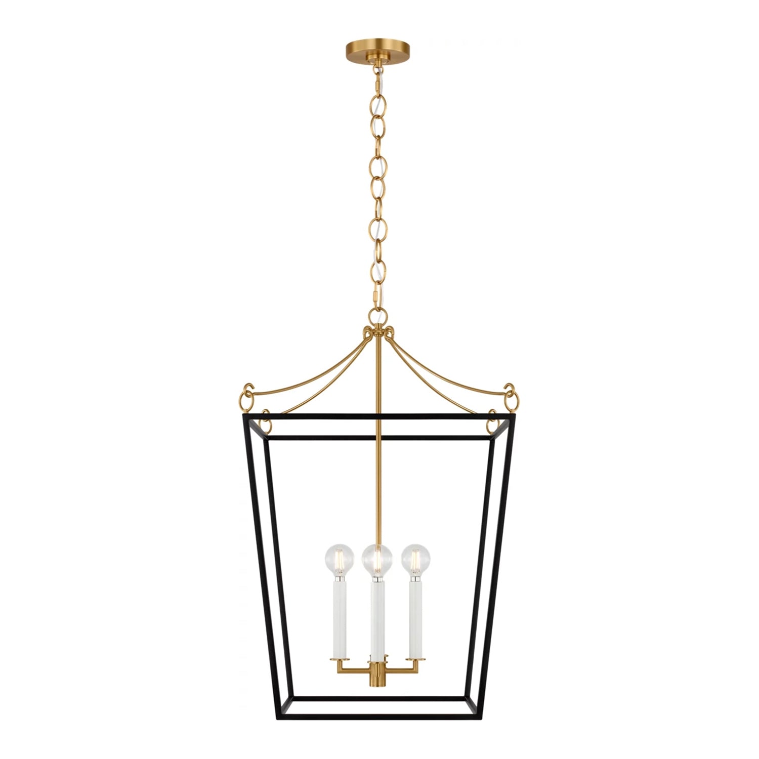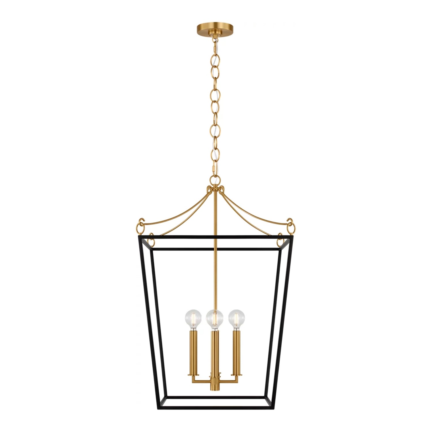 The Cambria Medium Lantern Pendant 18", Matte Black and Modern Brass reimagines the charm of vintage lanterns through a lens of sculptural elegance and thoughtful design. Defined by graceful contours and distinctive hanging loops that soften the silhouette, the upper frame curves with a fluid grace while the lower half features a classic cage construction that adds essential structure. The open-air design allows light to flow freely, while the two-tone finish creates a sophisticated contrast between the bold frame and warm accents. By blending timeless inspiration with a clean, contemporary aesthetic, this lantern adds an unmistakably modern character to any space.