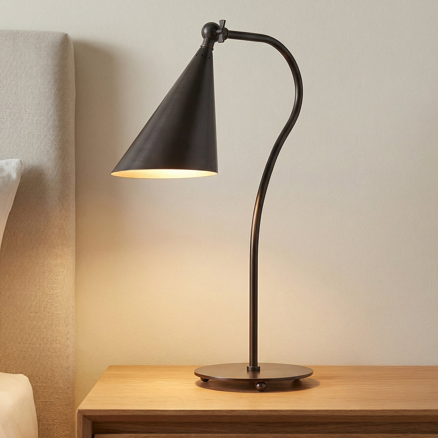 Inspired by classic elegance and modern versatility, the Faye Adjustable Table Lamp reimagines timeless design with a gracefully curved gooseneck arm and a rich old bronze finish. This sophisticated fixture combines refined style with practical functionality, featuring an adjustable head that allows you to direct light precisely where needed. The deep metallic finish adds a touch of traditional warmth to any tabletop surface, creating an inviting atmosphere. Blending form and function, this flexible lamp provides customized lighting, making it perfect for desk work, bedside reading, or accent lighting in living spaces. With its refined silhouette and warm, understated glow, the Faye Table Lamp effortlessly enhances both modern and transitional interiors.