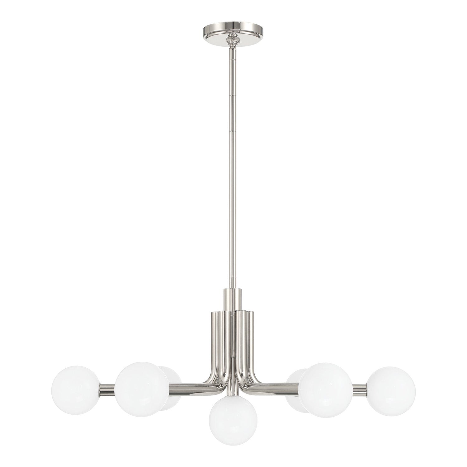The Maribel 7 Globe Chandelier 29" offers an artful fusion of mid-century inspiration and contemporary refinement. Its bold tubular metal frame features softly curved arms topped with cased opal glass shades, delivering a fresh expression of mid-century style with modern sophistication. This multi-light chandelier serves as a captivating focal point, casting a balanced, diffuse glow that enhances the ambiance of entryways, breakfast nooks, or dining spaces.