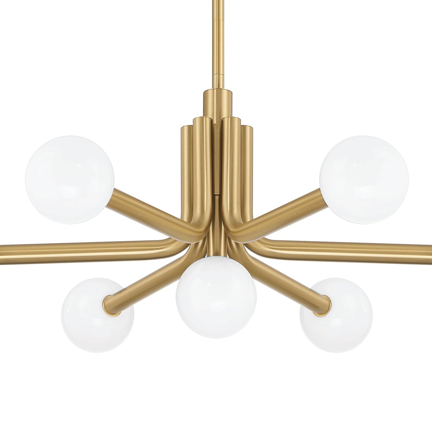 The Maribel 7 Globe Chandelier 29" offers an artful fusion of mid-century inspiration and contemporary refinement. Its bold tubular metal frame features softly curved arms topped with cased opal glass shades, delivering a fresh expression of mid-century style with modern sophistication. This multi-light chandelier serves as a captivating focal point, casting a balanced, diffuse glow that enhances the ambiance of entryways, breakfast nooks, or dining spaces.