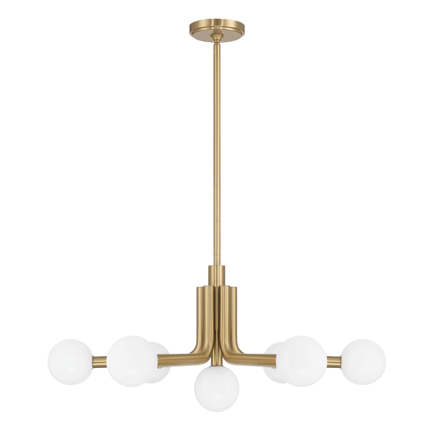 • Maribel features a bold tubular metal frame with softly curved arms supporting seven cased opal glass shades