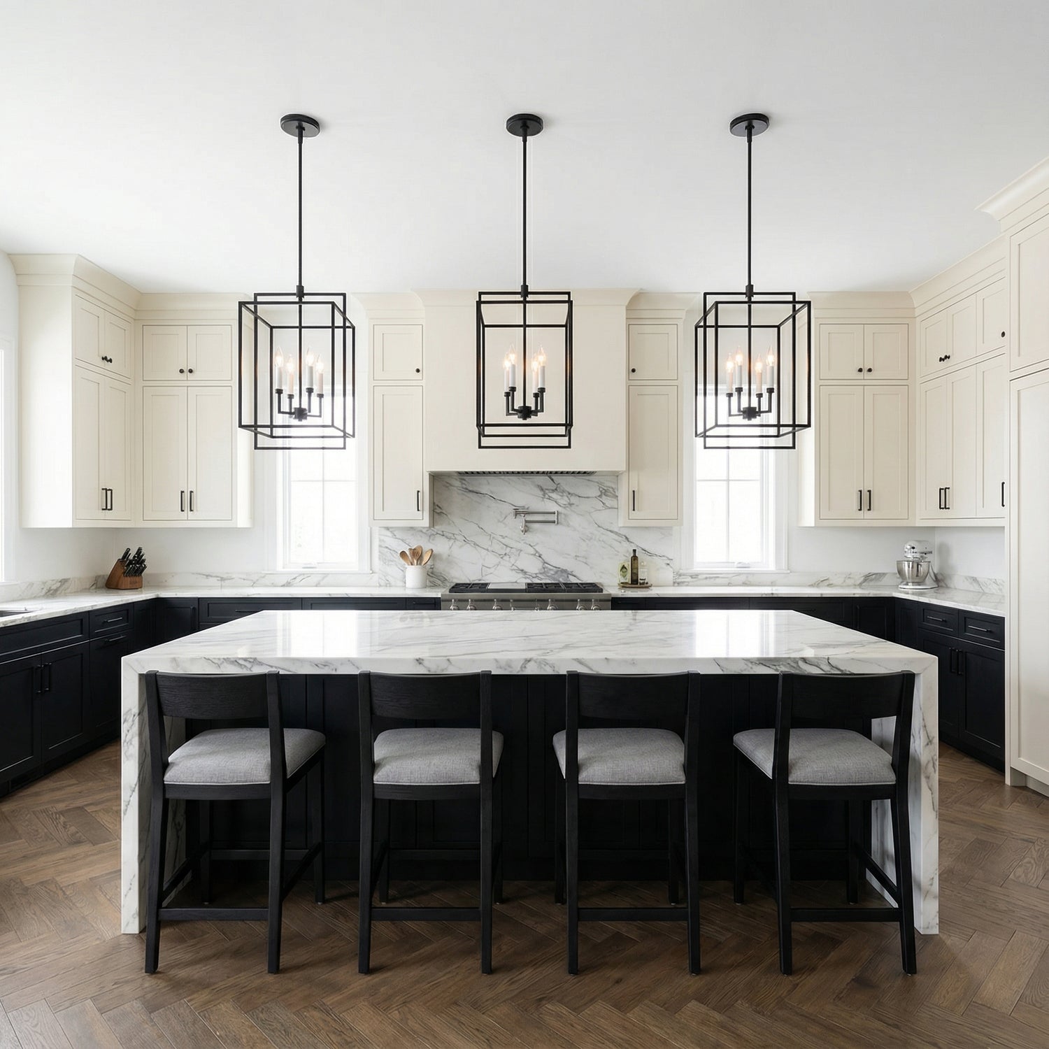 • Matte Black hanging pendant features four candelabra bulbs in an updated open frame lantern design, suspended by matching down rods