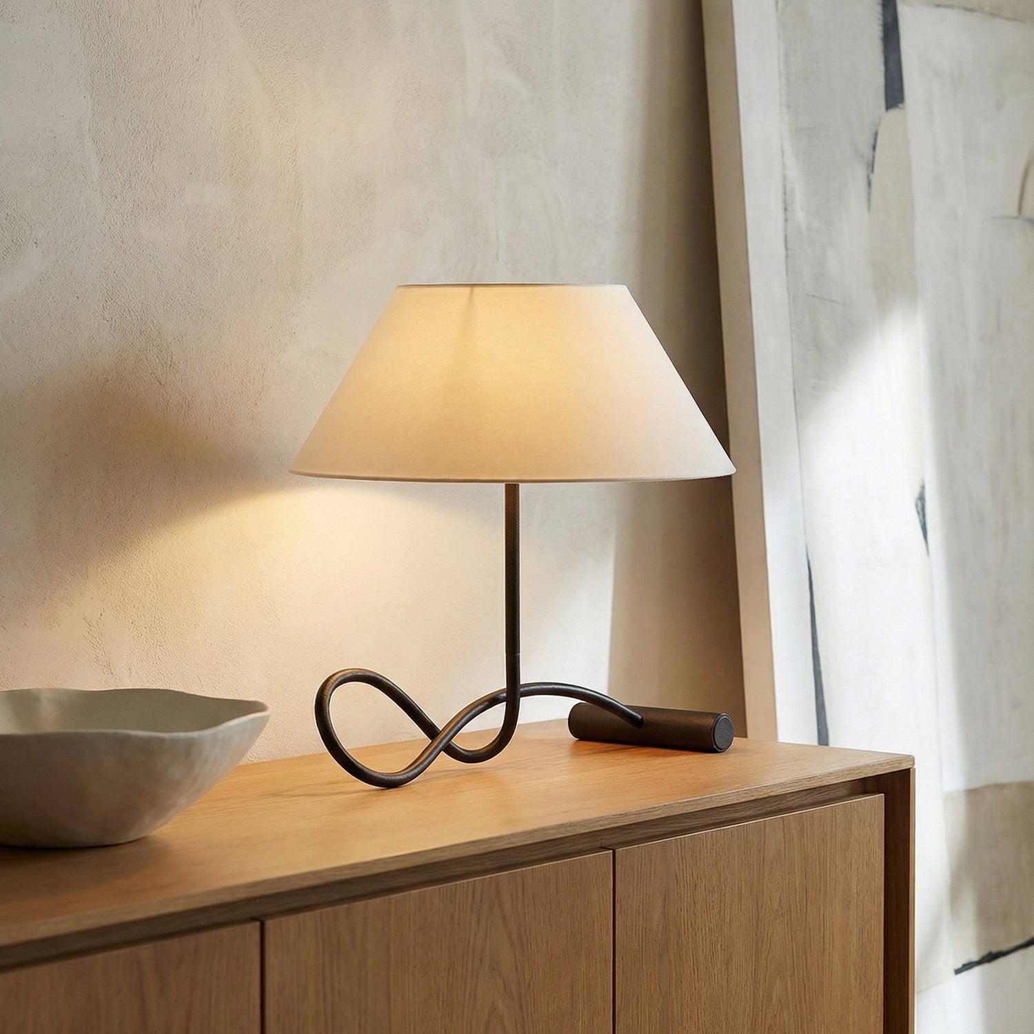 The Odin Table Lamp brings sculptural sophistication with its forged iron body that flows gracefully into elegant curves, supporting a crisp off-white paper shade. This striking design creates a beautiful juxtaposition of material and form, with the substantial iron framework contrasting beautifully against the lightweight fabric shade. The lamp's flowing lines and negative space create visual interest from every angle, making it perfect for bedside tables, living rooms, or accent lighting. This contemporary table lamp combines artistic appeal with functional lighting, adding chic modern style to any space.